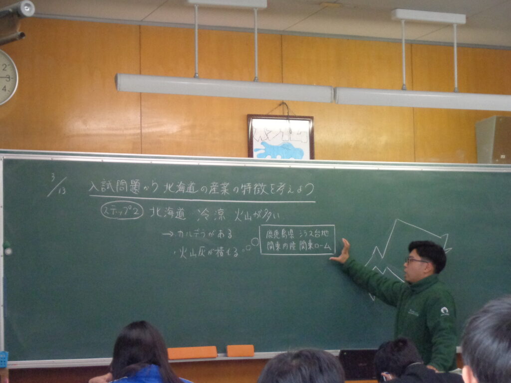 今年度の社会科の授業も大詰めを迎えました。入試問題を活用しながら北海道地方の特色について学習しました。問題を解きながら、北海道地方の農業や自然環境、産業の特徴を確認するとともに、他の地方との共通点や違いにも目を向けました。「北海道だけでなく、他の地方と関連付けて考えることが大切である」ということに気付けた生徒が多いように感じました。次年度に向けて、今年度のまとめをしっかり行っていきます。