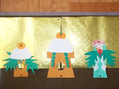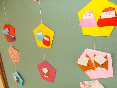 1年生は図工で「おって たてたら」の作品を作っていました。違う色を2枚貼り付けて裏表で色を変えてみたり、かごに持ち手をつけてみたり・・・。工夫がいっぱいの楽しい作品ばかりでした。後ろの掲示板には、子どもたちが作ったサンタさんもいました。