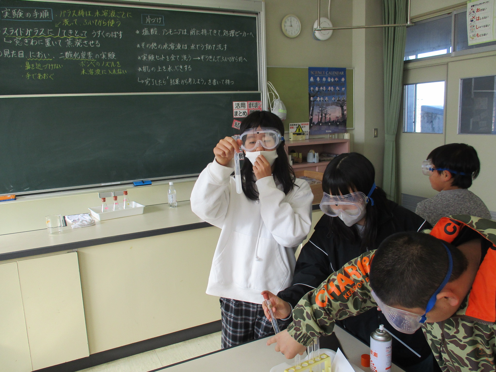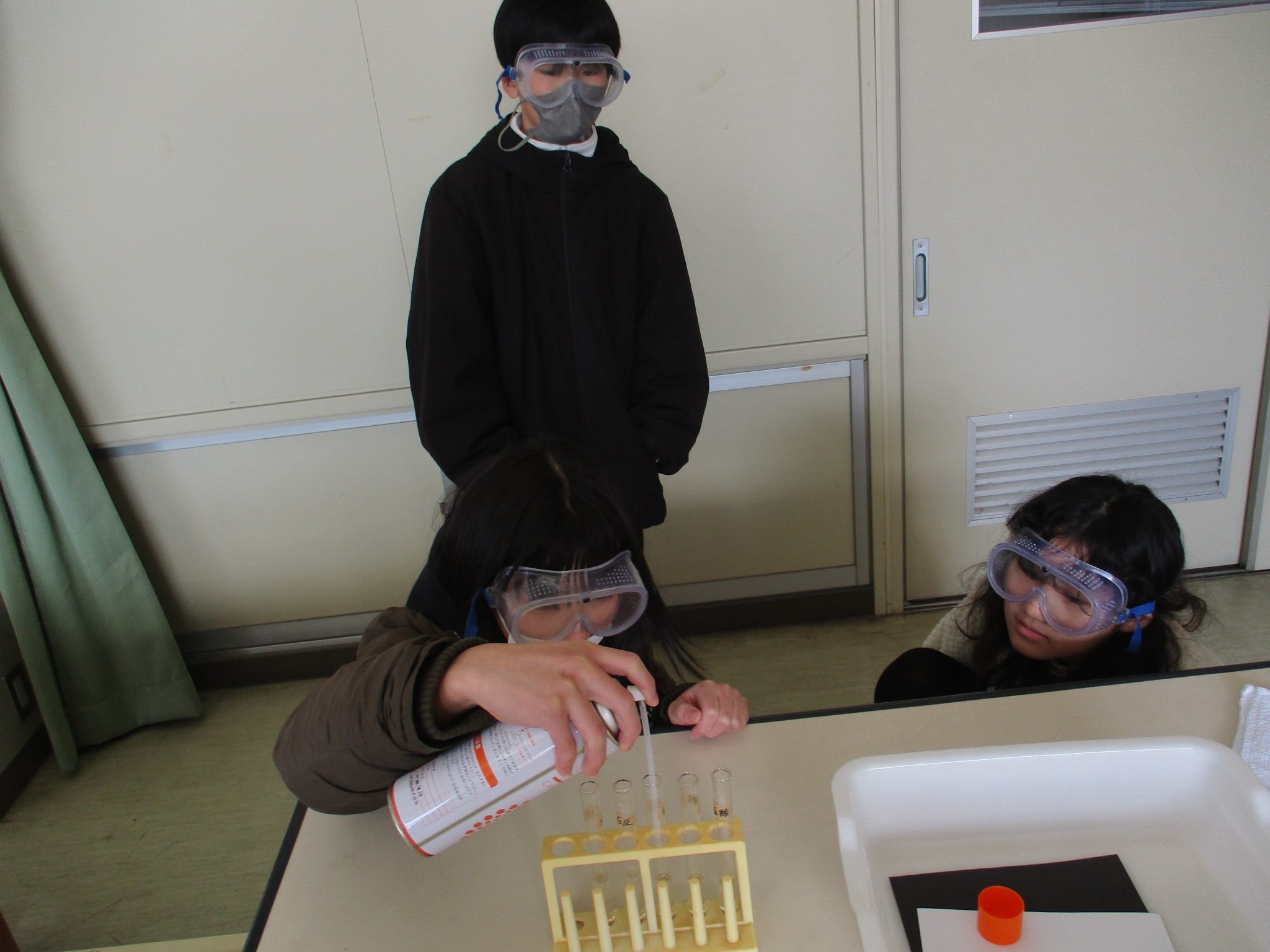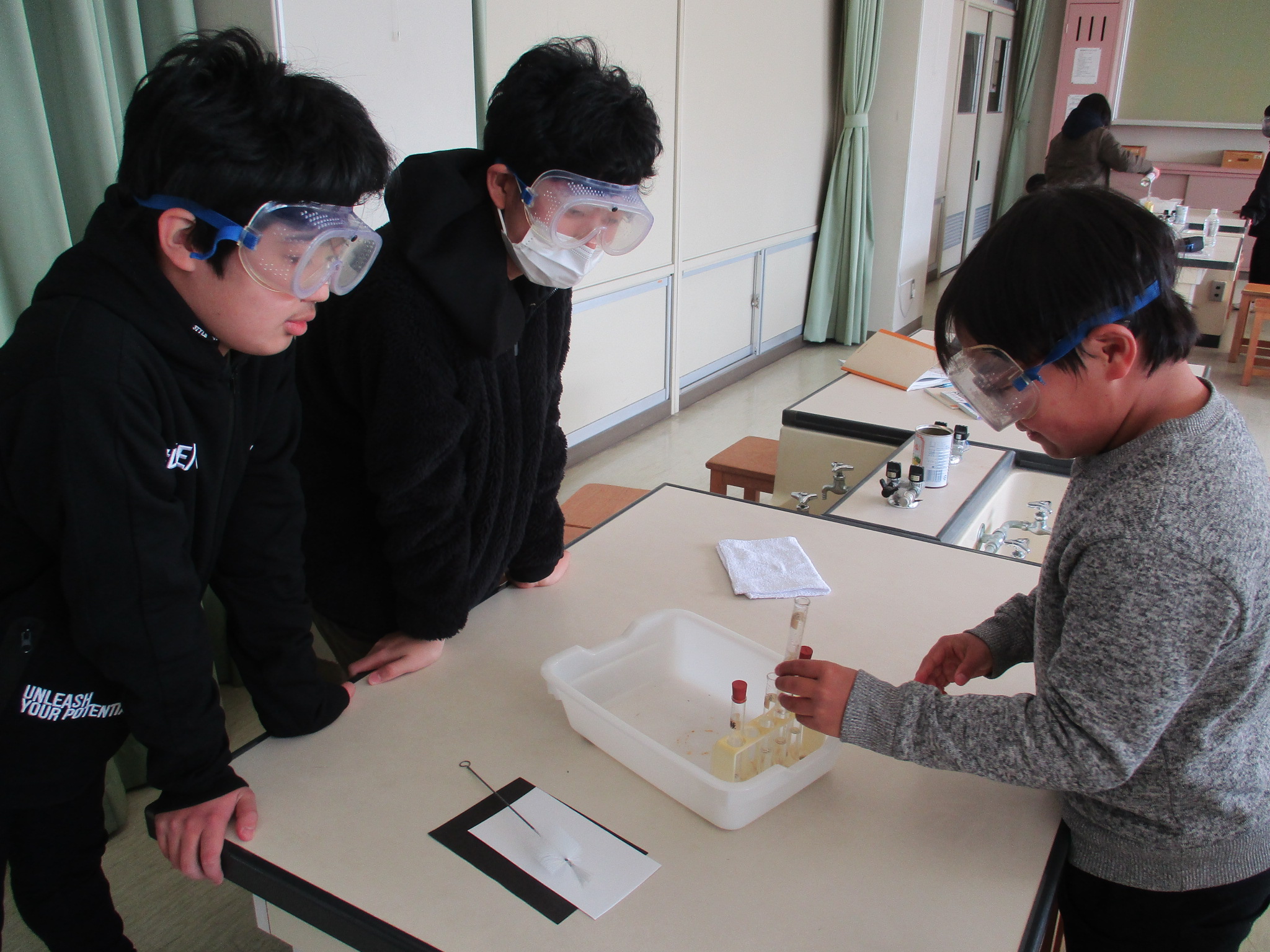 4年生の理科の様子です。今日は水や金属のあたたまり方についての実験に取り組んでいました。水や金属のあたたまる様子が色で確認できるので、とても分かりやすい実験です。