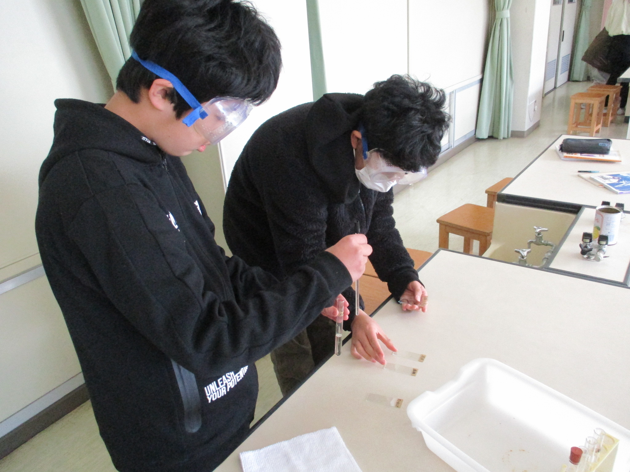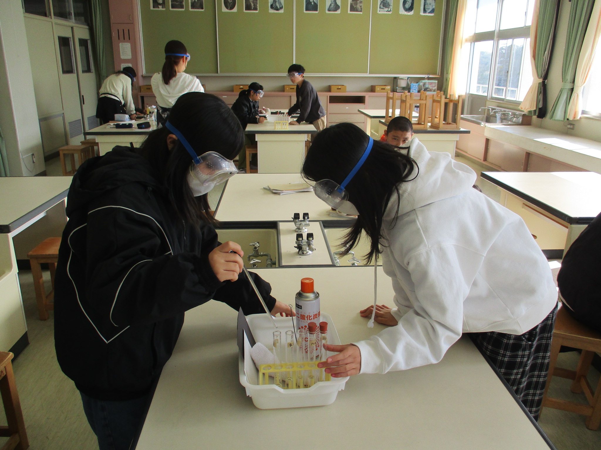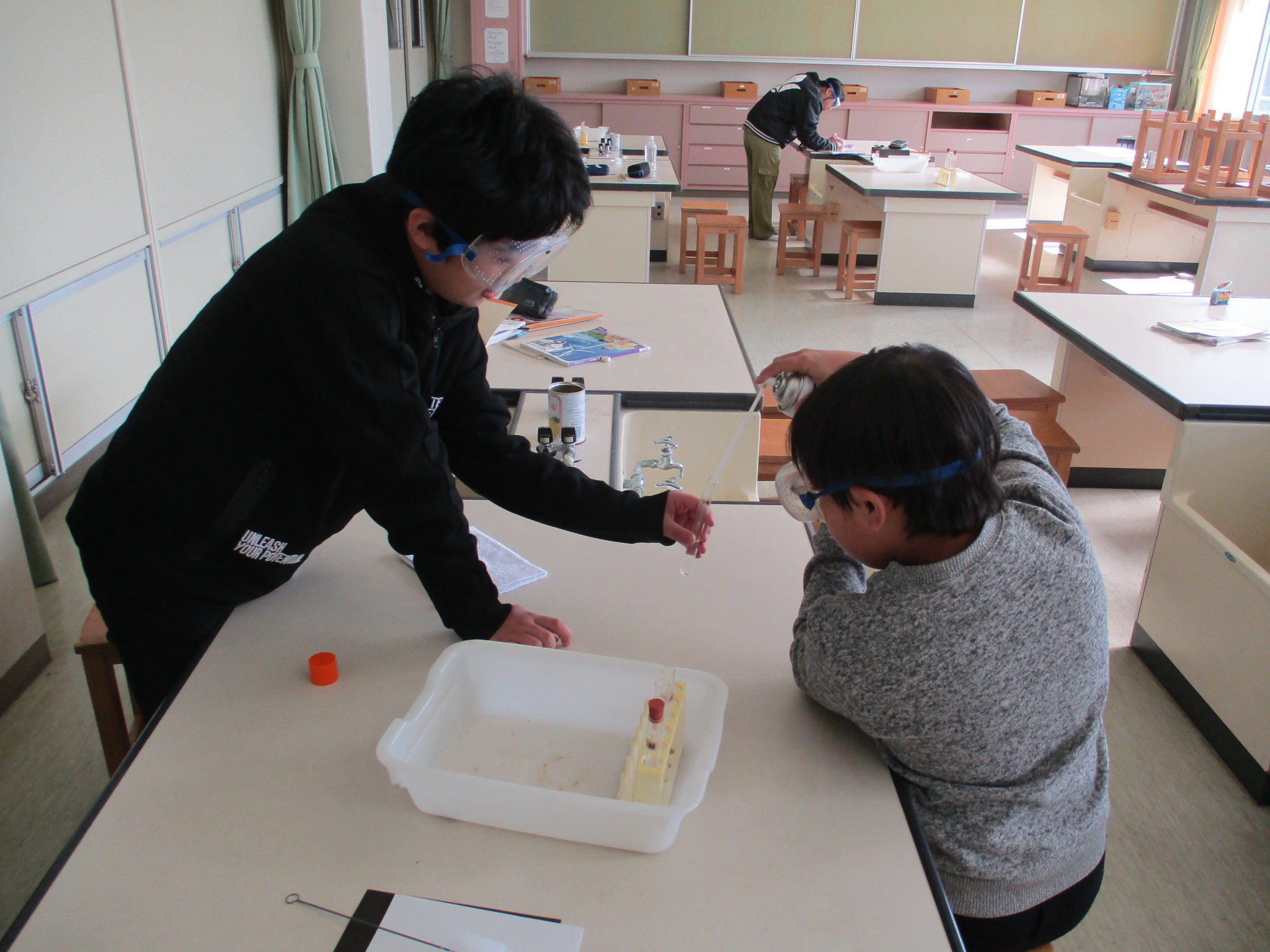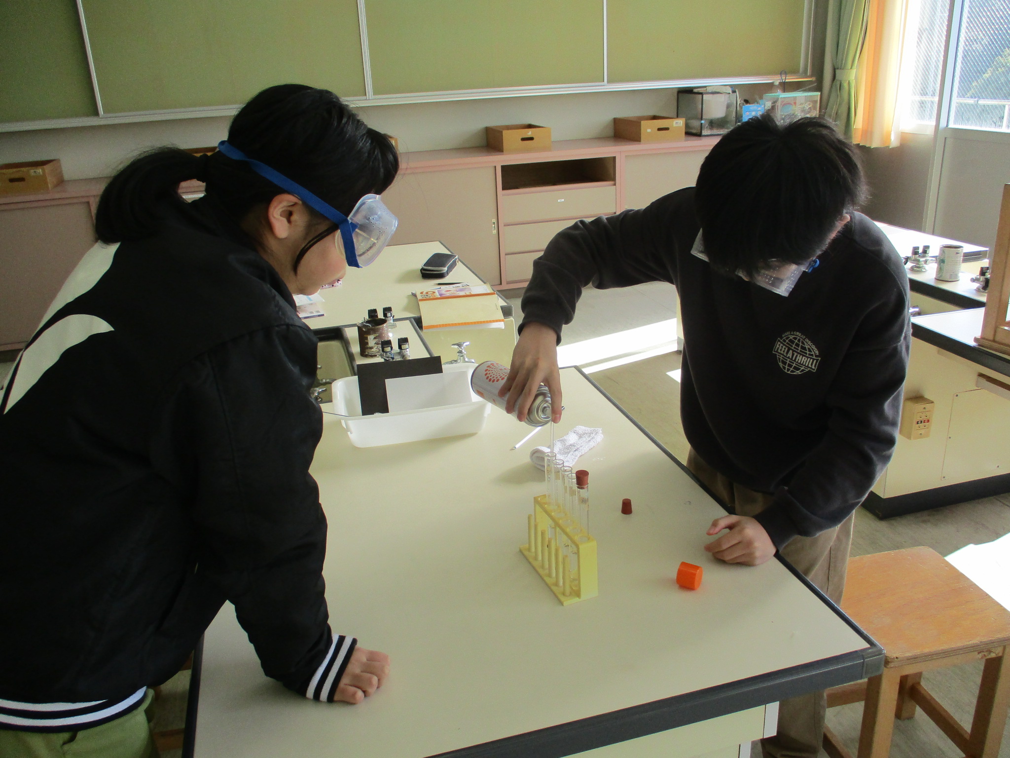 4年生の理科の様子です。今日は水や金属のあたたまり方についての実験に取り組んでいました。水や金属のあたたまる様子が色で確認できるので、とても分かりやすい実験です。