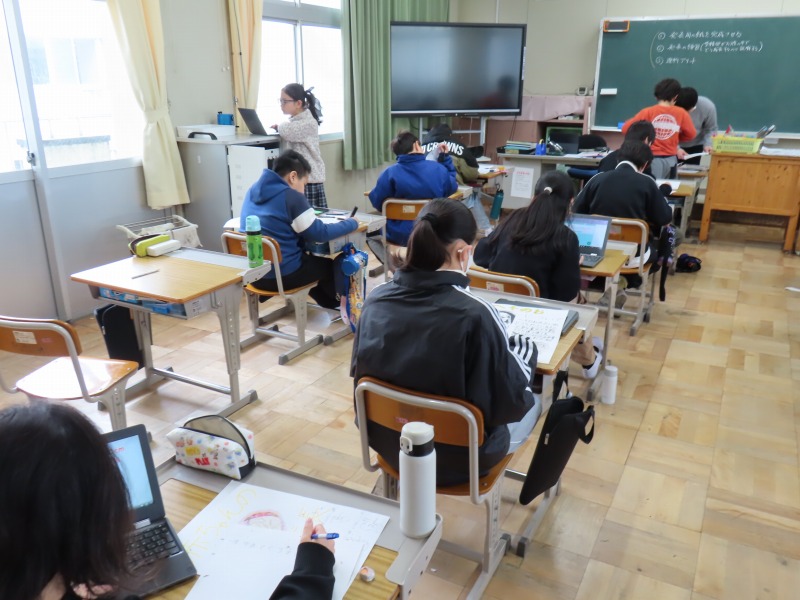 1・2年生の授業の様子です。1年生は「キャリアパスポート」をまとめています。ちなみにキャリアパスポートとは、小学校から高校までの学習や活動を記録し、自己評価や将来のキャリア形成に活かすポートフォリオです。