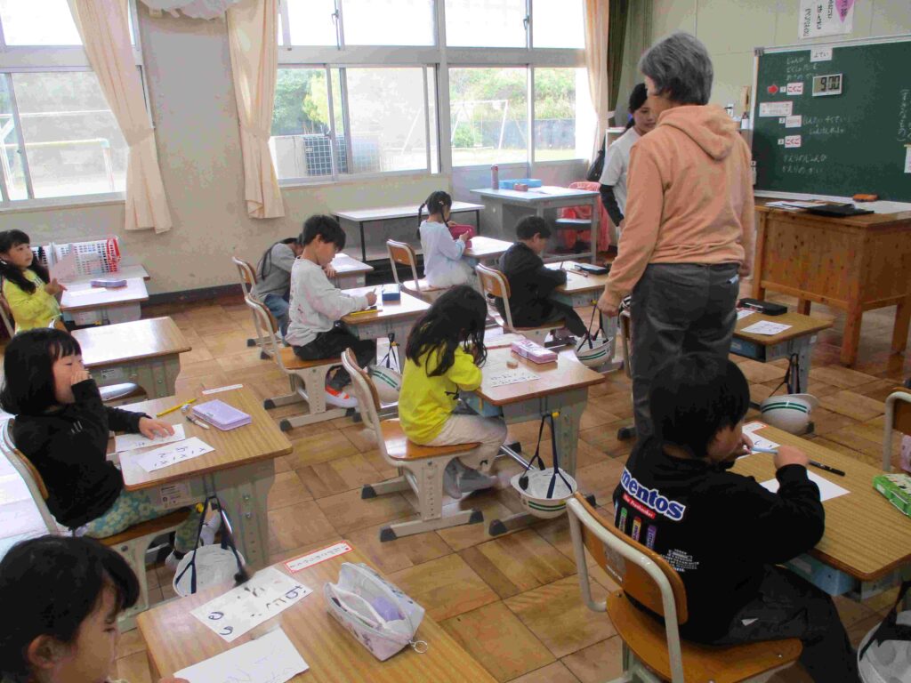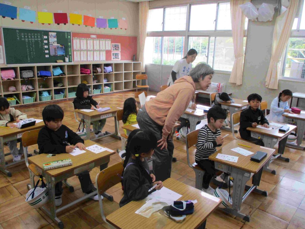 書く:1年生、縦に名前を書いて名刺を作っていました。