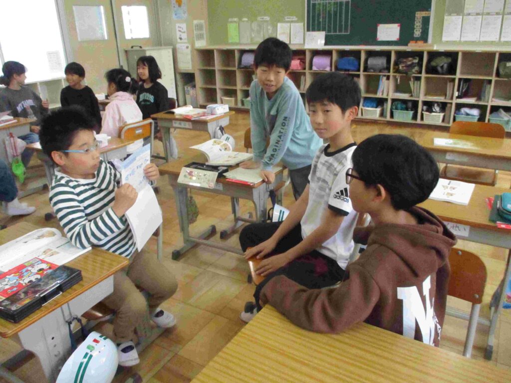 話す:5年生国語「ひみつの言葉を引き出そう」の一場面。ノートに示してある言葉をノートをもった子から引き出そうと、周囲の子が言葉を選んで話していました。この先、「書く、見る、聞く、読む、話す」の力を高めていきます。