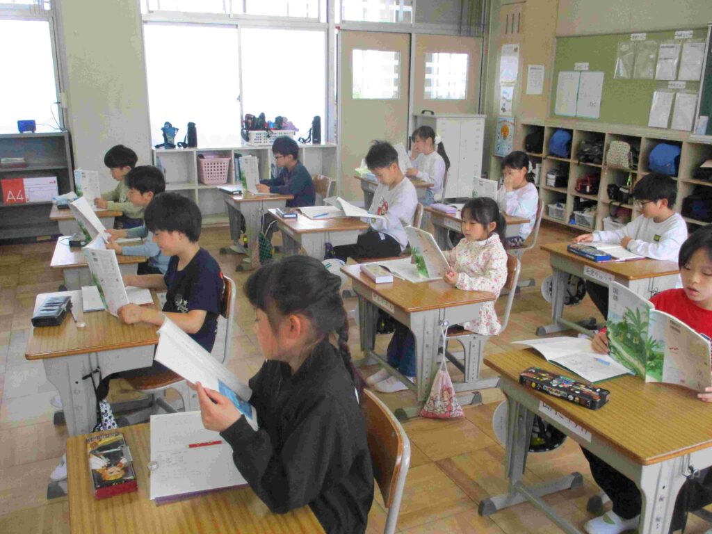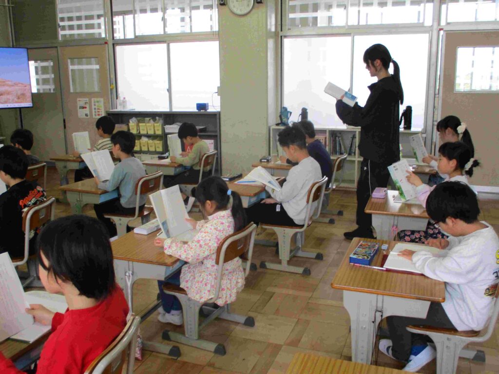 読む:3年生国語では、先生が読んだ箇所を子どもたちが読んでいました。