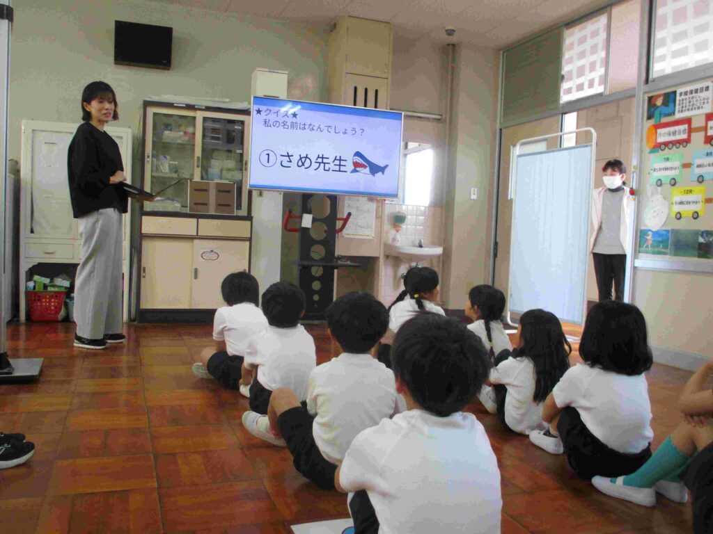 聞く:1年生が保健の先生による「保健室の使い方」の話を聞いていました。