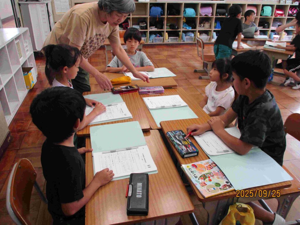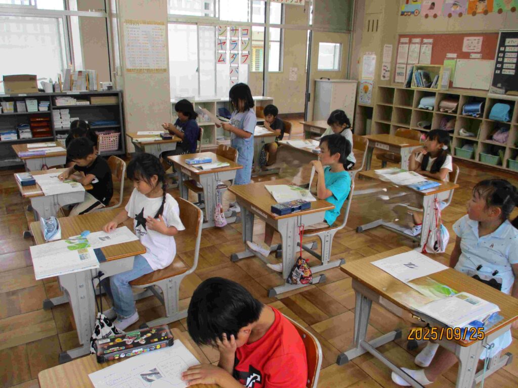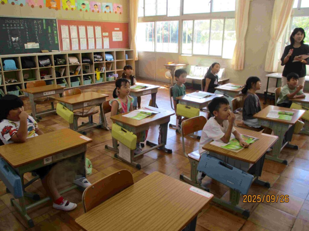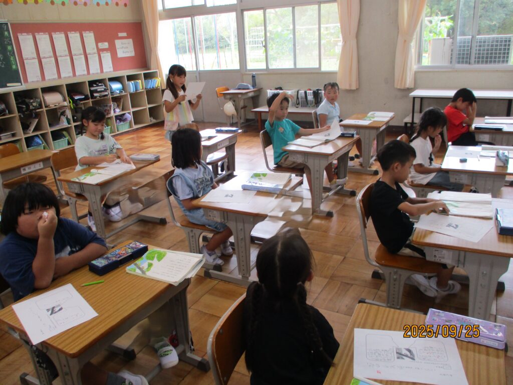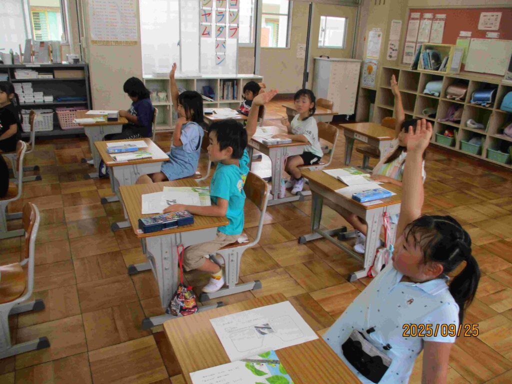 1年生は国語「やくそく」に登場する3匹のあおむしに着目して学習しました。先生から「海をめざして進んでいくあおむしのうち、先頭のあおむしは何を話しているのか」との問われ、自分の考えをワークシートに書き込んでいきました。はりきって元気に答えていました。