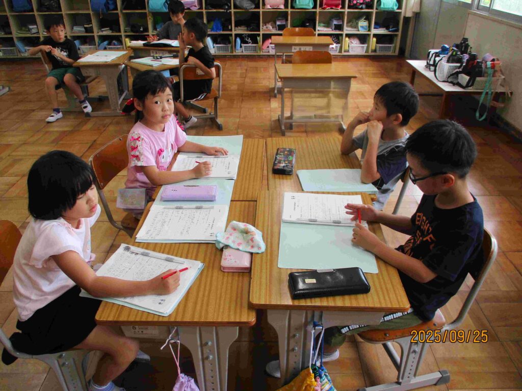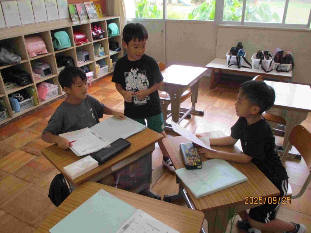 2年生生活科「まち たんけん」の質問を考えました。グループになり、聞いてみたいことを出し合って質問を決めていきました。「あ、一緒になったね。じゃんけん。」「2つともそれでいこう」と伝え合い、互いの思いを通わせながら進めていました。