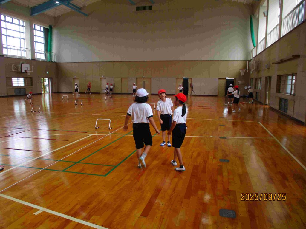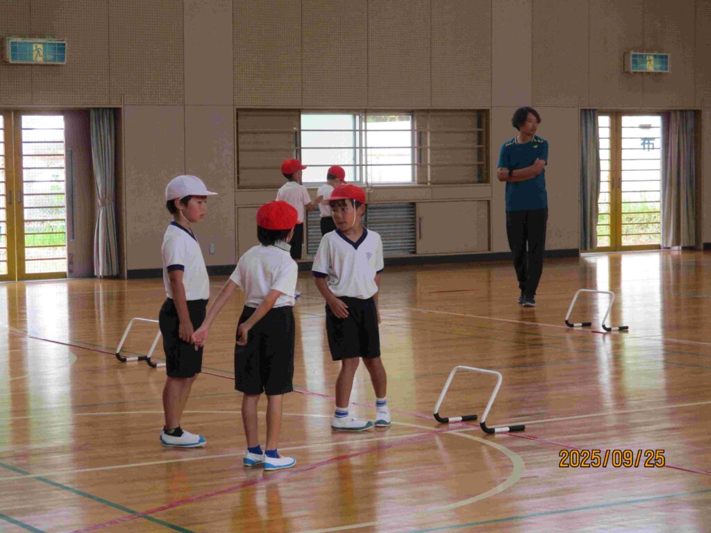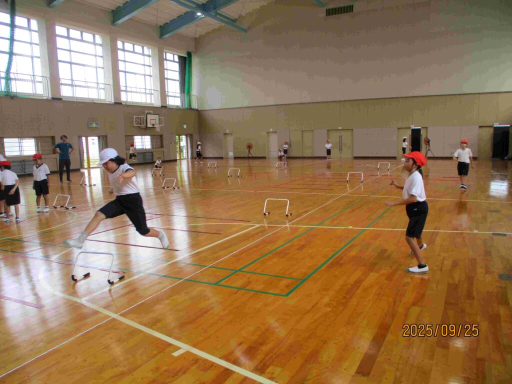 3年生体育「ハードル走」の様子です。3歩のリズムでテンポよく駆け抜けていくこと、またぎ越す際のポイントを意識して練習しました。「振り上げた足をすぐに下ろせてたよ」「ピョンピョンしていなくていいね」「スピードOK」互いにアドバイスを送りながら、パフォーマンスを高め合っていました。