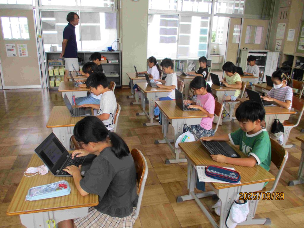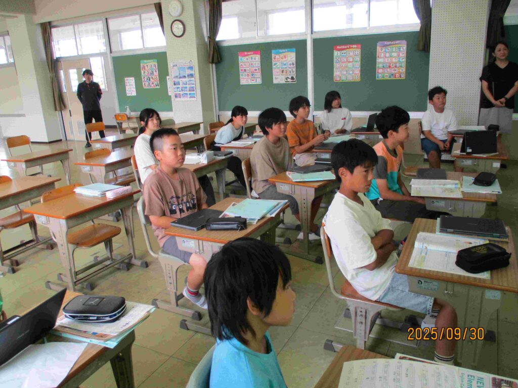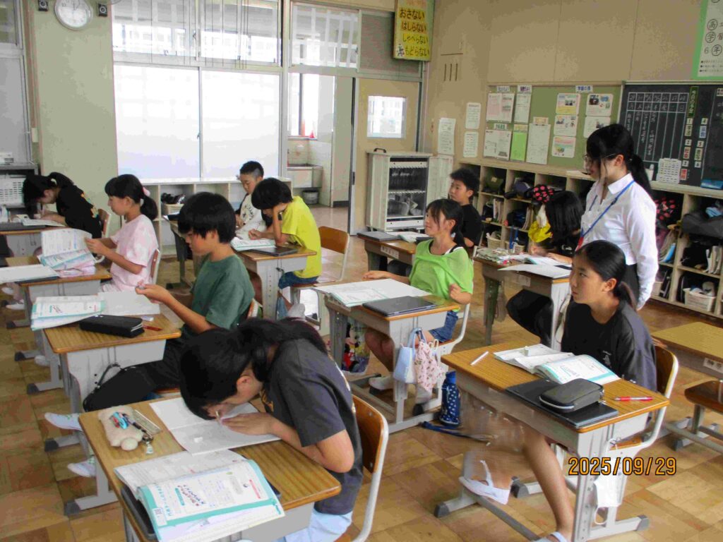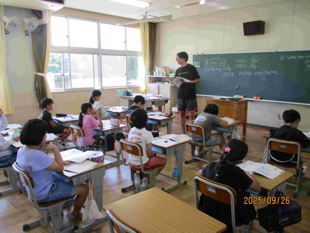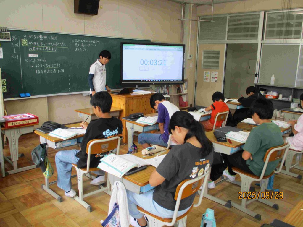 6年生算数では「データの整理と活用」を学習しました。データのちらばりを点で表した図をもとにして問題を解いていました。また、今日から教育実習が始まり、実習生が授業づくりや教育活動について学んでいます。6年生の配属です。教育を志す学生、教師、子どもたちの関わりから相乗効果が生まれることを期待します。
