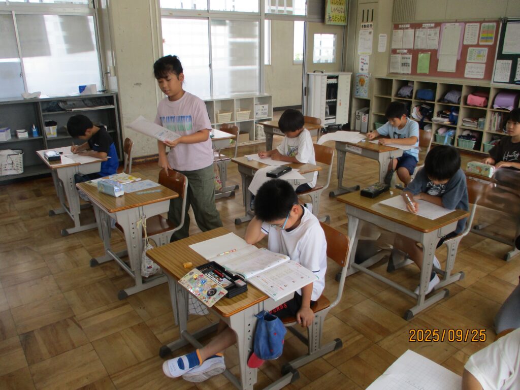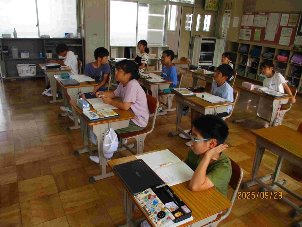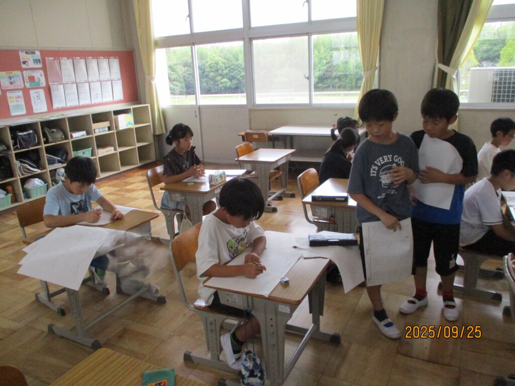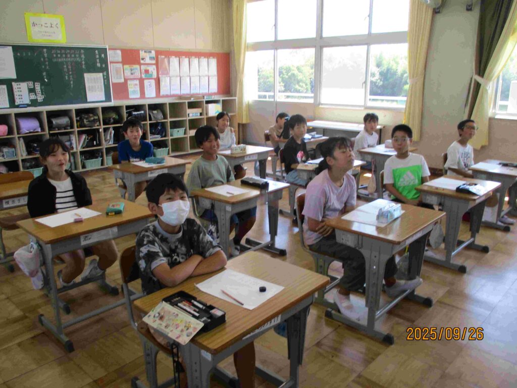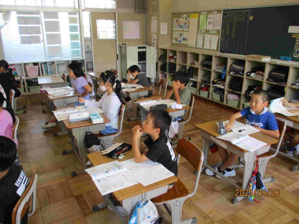 5年生は書写「気球」を練習していました。一筆一筆を大切にして書き上げていきました。小声で「よし」とつぶやきが聞こえたので、書かれた字を見ると「球」の点が…。慌てて、点を打っていました。セーフです。