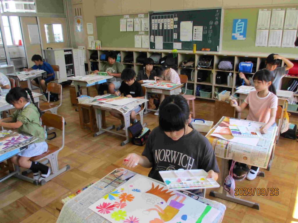 5年生図工「物語の世界を描く」では、下描きが完成し、色を塗り始めていました。混色づくりも一工夫。柔らかな色合いで描き始めたり、登場人物の表情を豊かにしようと色を重ねたりしていました。