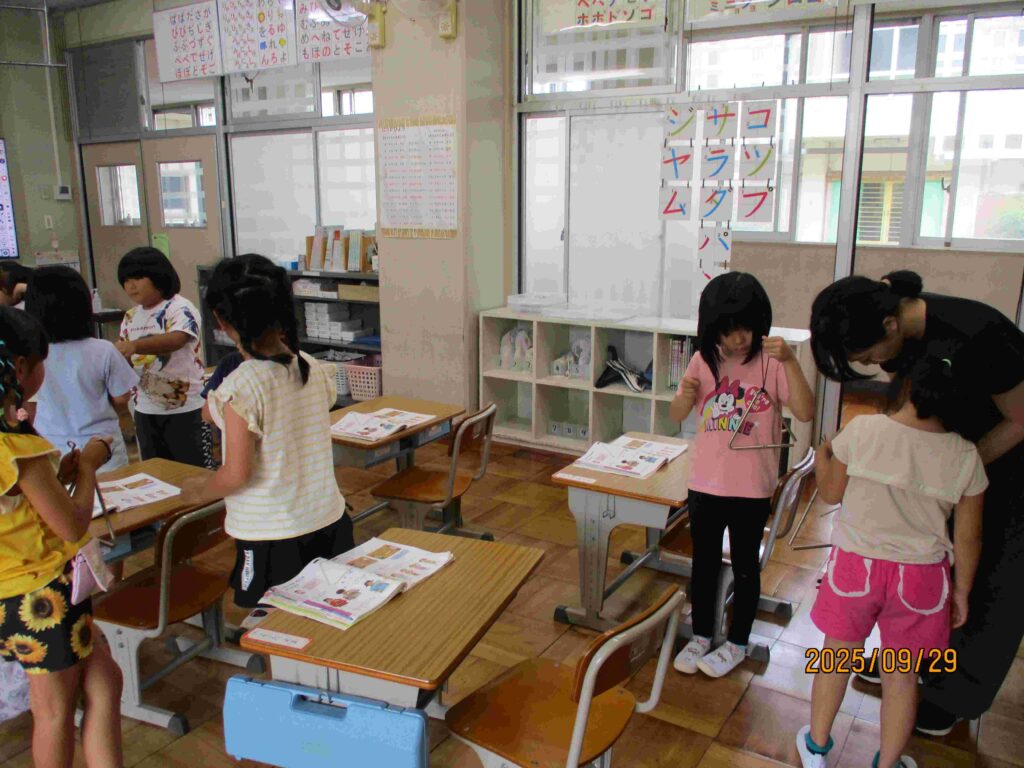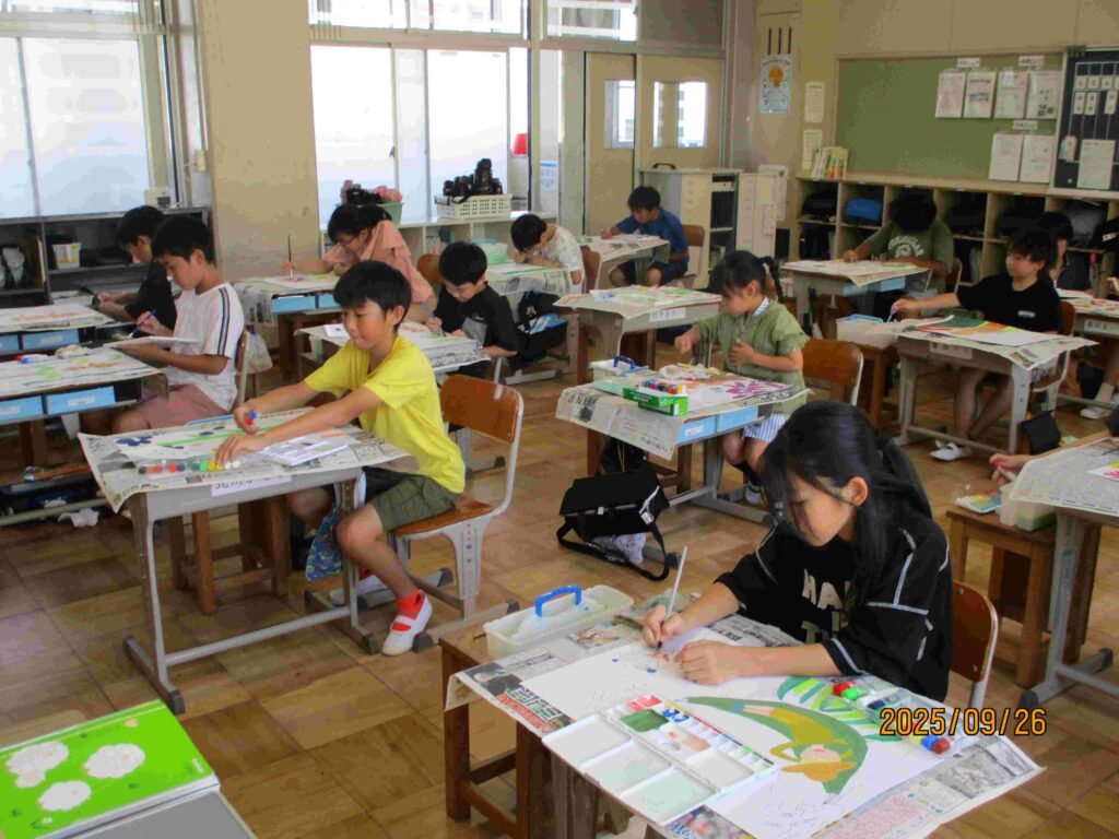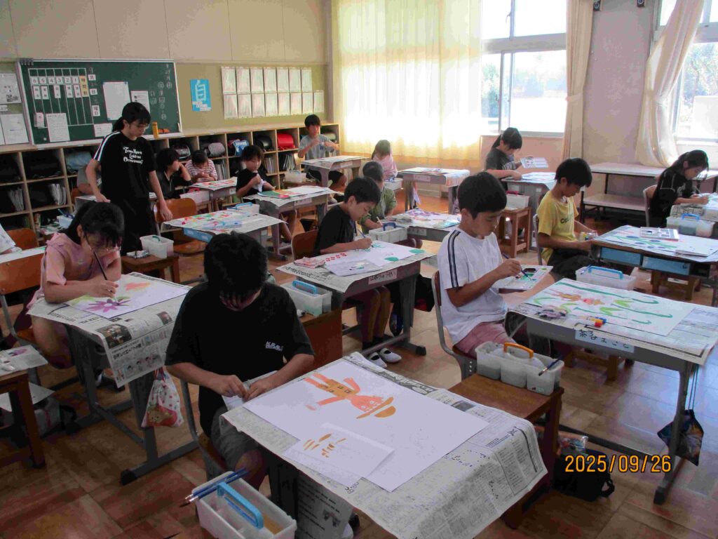 1年生は「おもいうかべたようすを かこう」。2年生は「読書感想画」です。1年生は、いろいろなポーズの見本を見ながら、水泳の様子を描きました。2年生は、「さるかに合戦」で一番印象に残った場面を描きました。どの子ものびのびと大きく絵を描いていました。