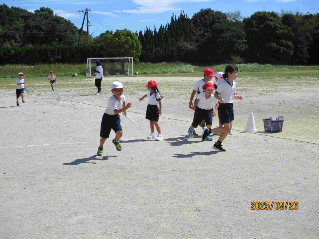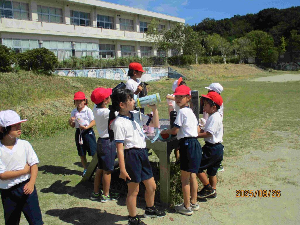 2年生体育「リレー」の様子です。授業の終盤となりいよいよ勝負。「いけー!」「がんばれー!」と仲間の声援に応えようと全力疾走。最後のチームがゴールすると各チーム拍手を送っていました。走り終わった後は水分補給。「おいしい」とニッコリ笑顔でした。
