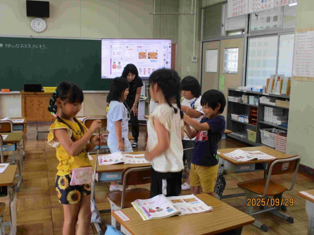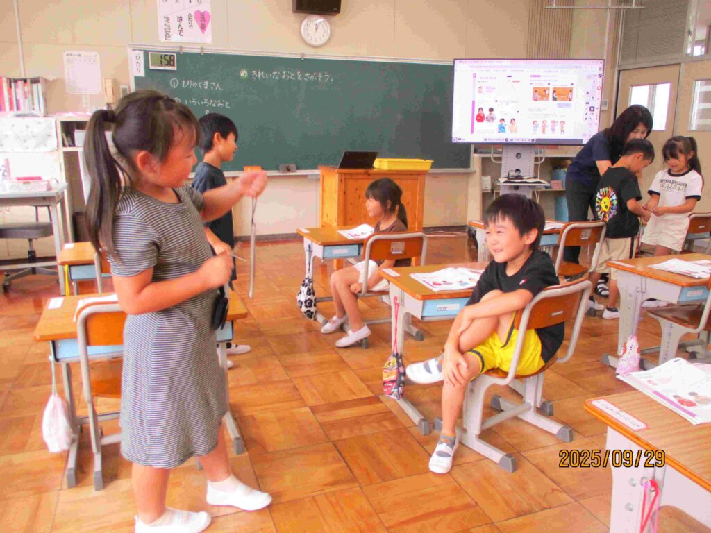 1年生音楽「もりの くまさん」では、掛け合いの歌詞を交互に歌って楽しみました。テンポも速めですが体を揺らしながらリズムをとって歌うことができました。声の大きさ音とバッチリでした。