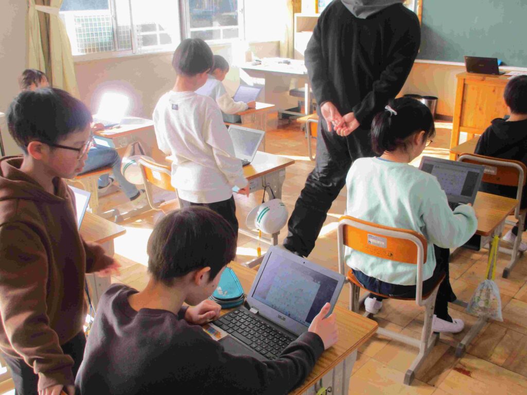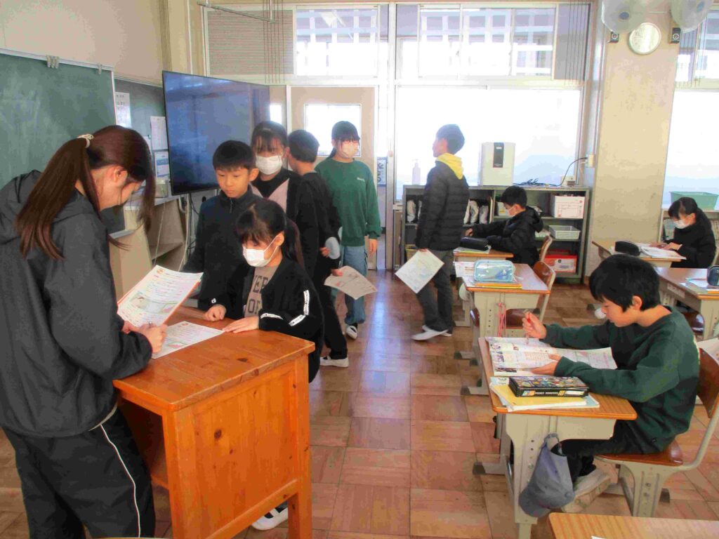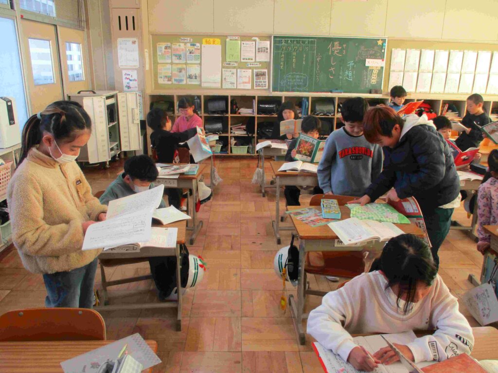 3年生国語では、「三年とうげ」の学習を終えて次のステップへ。今日は、「おもしろいところを見つけながら民話を読み、自分が選んだ民話を友達に紹介する」にチャレンジしました。おもしろさを伝える紹介文を書き、読み直し、友達に文を読んでもらって…、紹介文の内容がどんどんよくなっていきました。