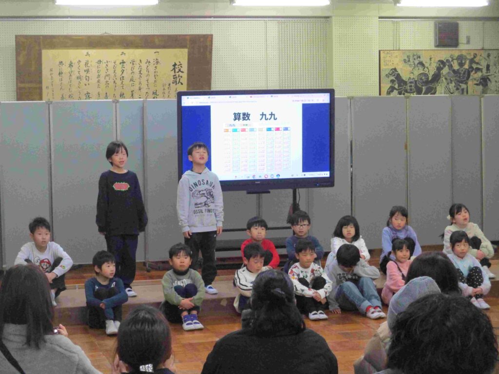 1年生「ともだち いいな ~できるようになったこと~」では、音読やスピード計算、チャンツ、鍵盤ハーモニカの演奏、なわとびを披露しました。