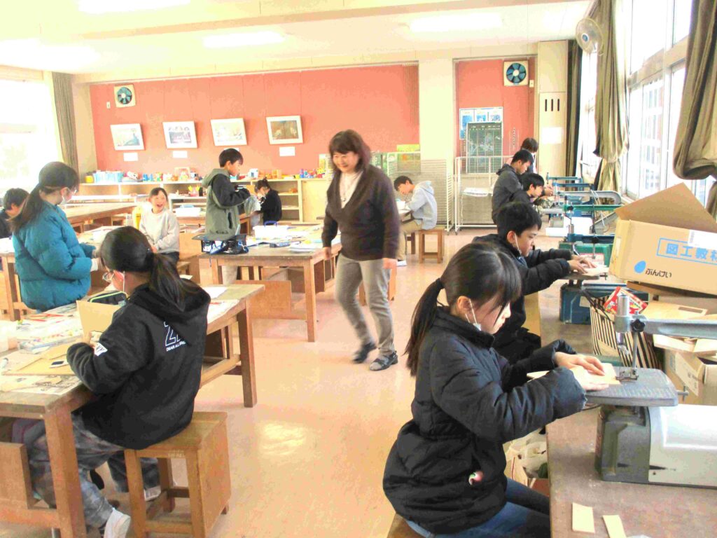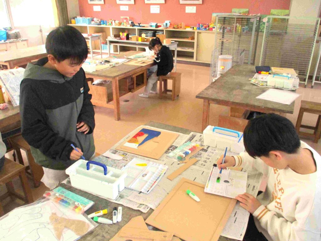 5年生図工「切り分けた形から」の様子です。一枚の板をパズルや迷路の様に仕立てていきました。糸鋸で切り離していって、色を塗っていきました。完成作品が楽しみです。