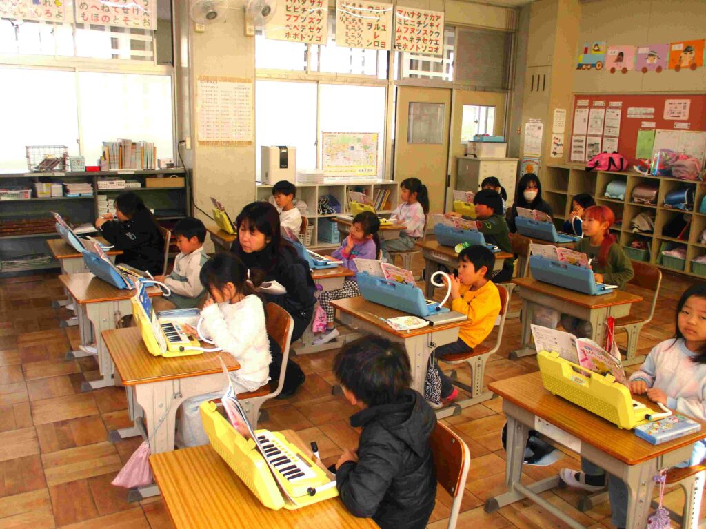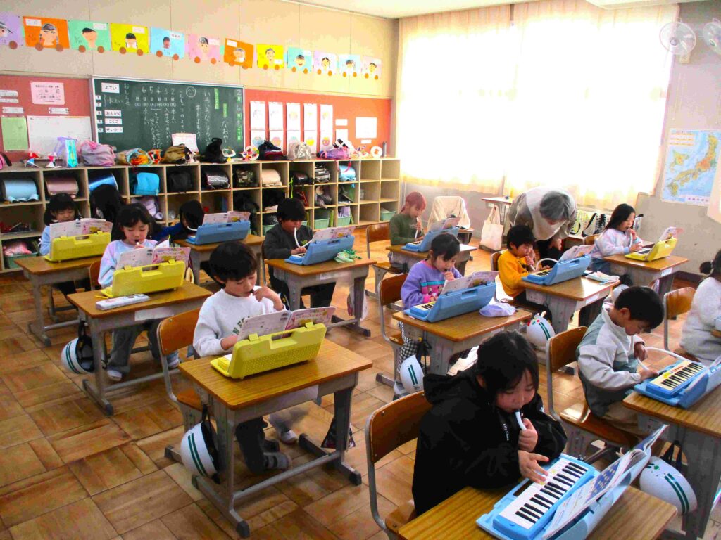 1年生音楽では鍵盤ハーモニカでドからソの音を自由につなげてリズムを付けて演奏していました。最後には一人一人考えた節をつなげて、1年生オリジナルソングができあがりました。2年生は、級友に向けて「ありがとうの手紙」を書いていました。あたたかくてやさしい手紙となるよう、先生からアドバイスをもらっていました。