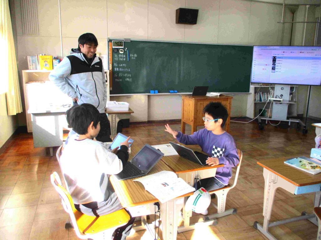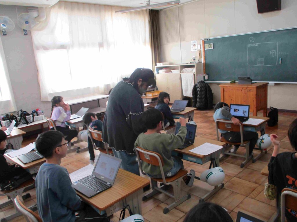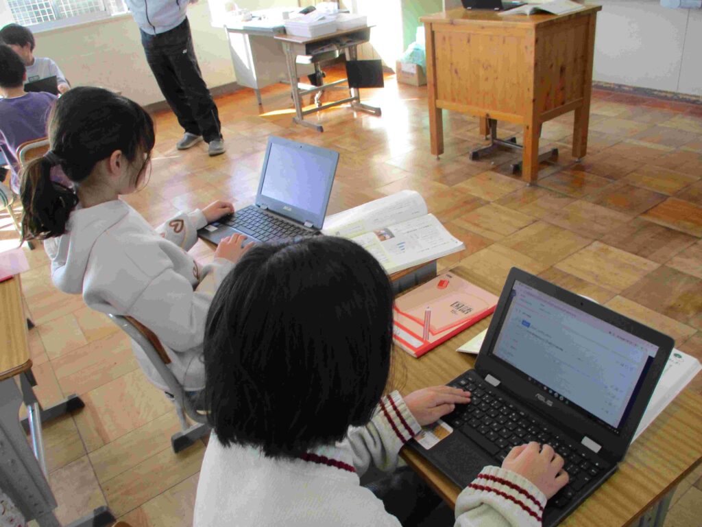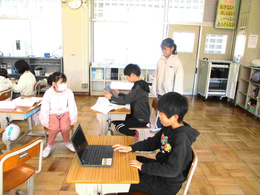 4年生国語、「説明の資料をつくろう」の学習の様子です。各グループで役割分担をすると「給食のこと?」「アンケートを作るね」「こんな感じでどう」など話し、タブレットを使って進めていきました。