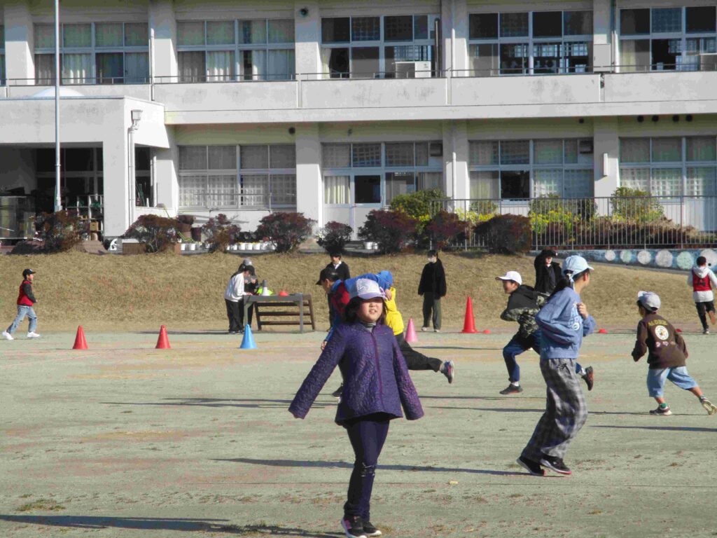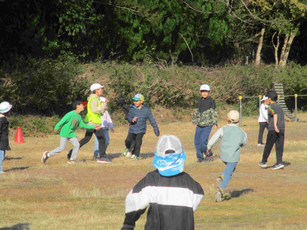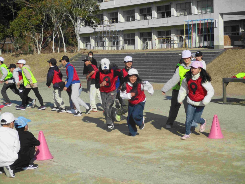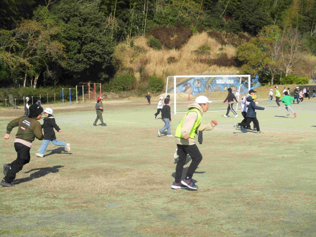 児童会企画「全校おにごっこ」を開催しました。前半は1~5年生が6年生を追いかけます。挟み込んだり追い込んだりして6年生を捕まえていました。