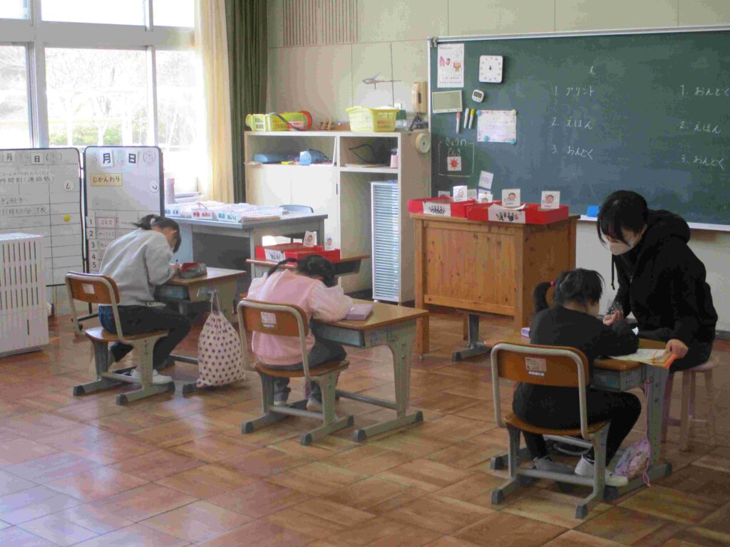 「読む、聞く、書く」を積み重ねて力をつけた子どもたち。つつじ学級では、文字を読む、書くの学習をしていました。1年生は「2年生になったらやってみたいこと」をどんどん書いていきました。2年生は「3年生の教科内容をインタビュー」で印象に残ったことをまとめていました。たいへんよくがんばっていました。