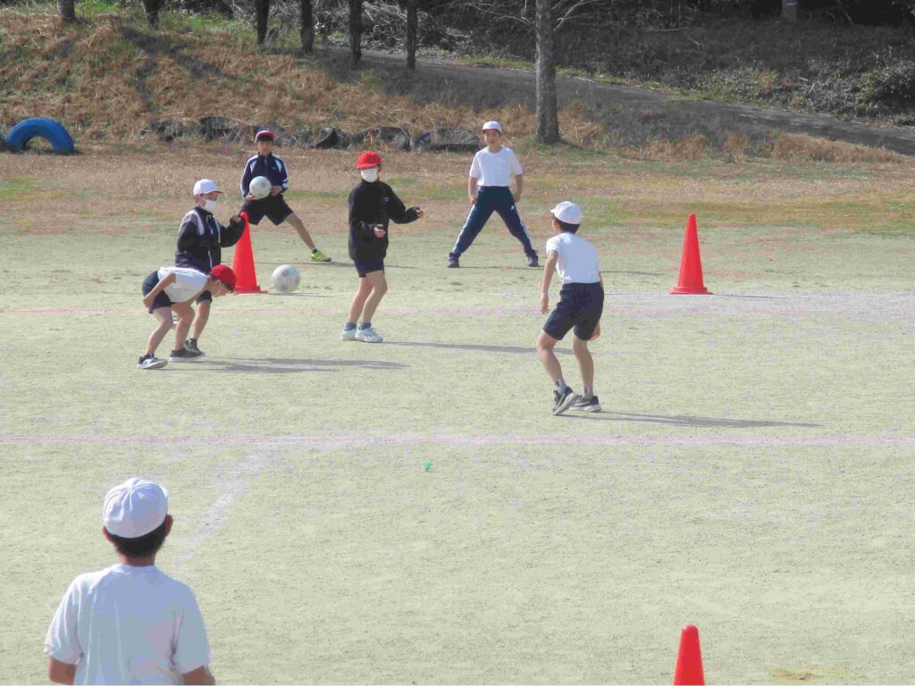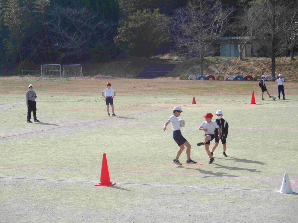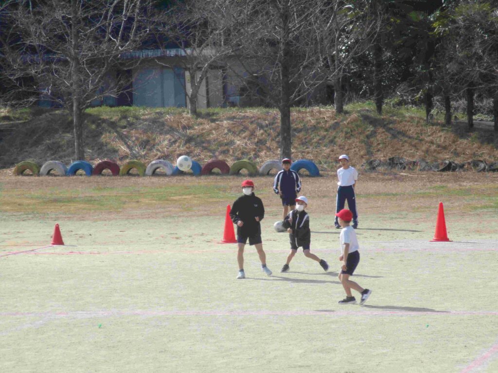 5年生はサッカー、互いに声をかけ合って楽しくプレイ。「OK!」「ナイス!」「いけー!」とよく声がでていました。