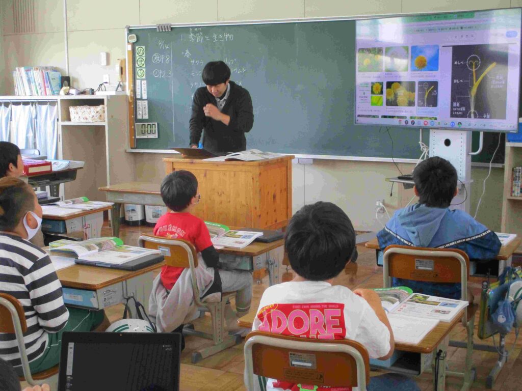 4年生理科では、花のつくりについて学習していました。「タンポポの花はね…」と先生の話を聞くと子どもたちは驚きでいっぱいでした。このあとは春の花々を観察しに屋外へ。春の風を心地よく感じながら花をじっくり眺めたり、タブレットで撮影したりしました。