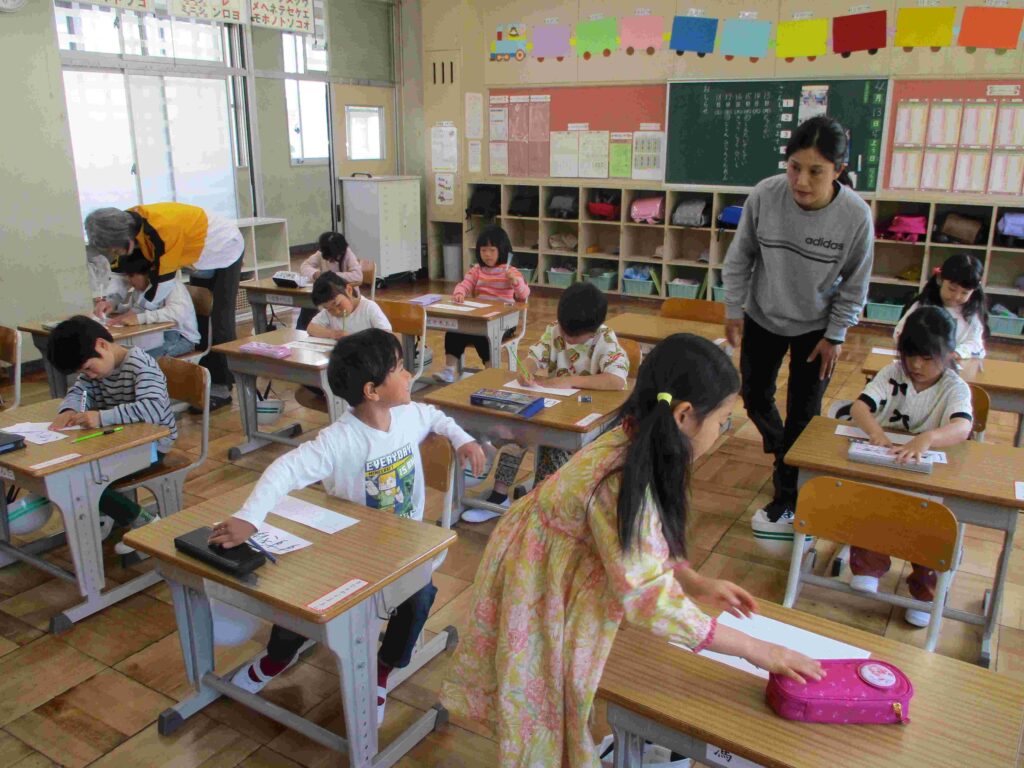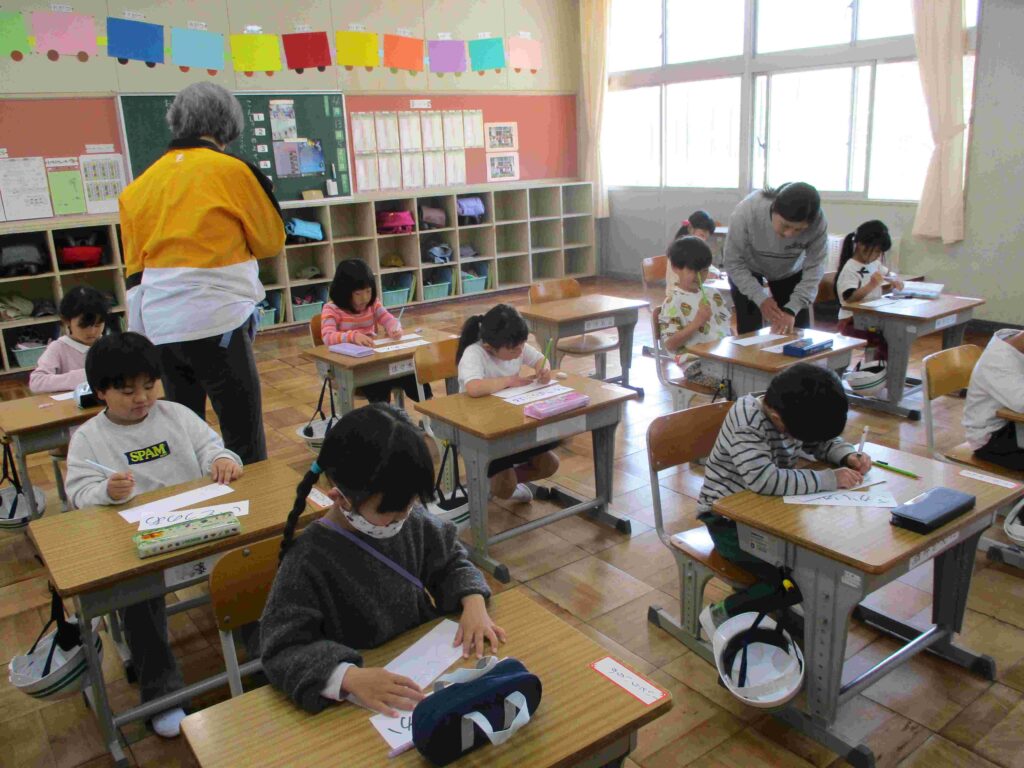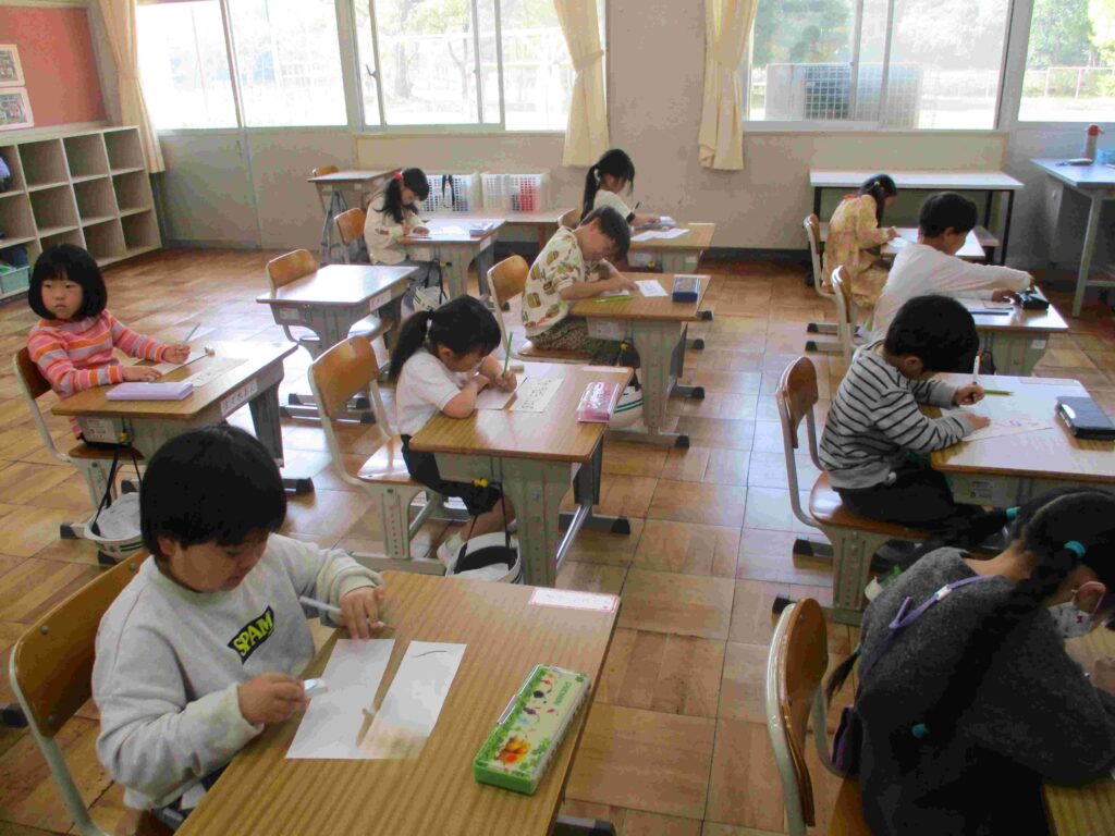 1年生の様子です。横長の画用紙に名前を書いていました。鉛筆で大きく名前を書くと、名前ペンでなぞりました。「手が震える…。」しっかり書こうと思わず力が入ってしまいました。力強くていねいに書けました。