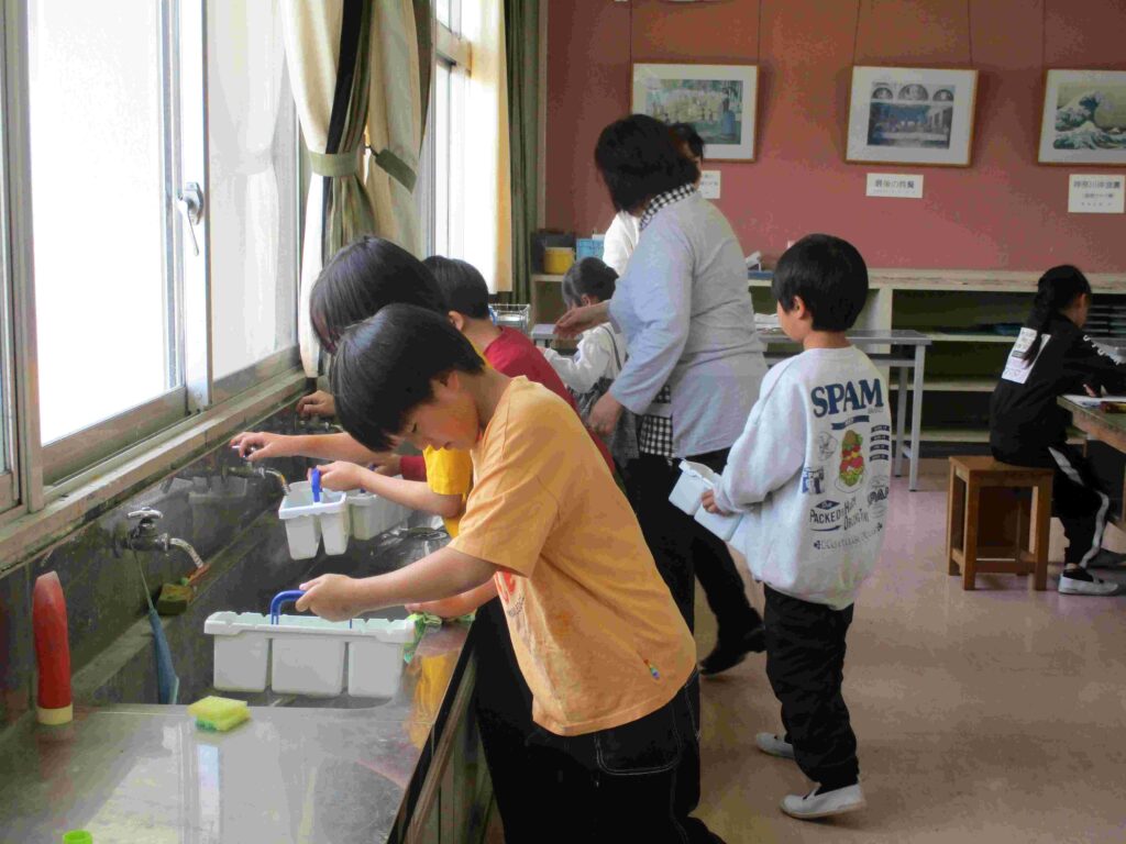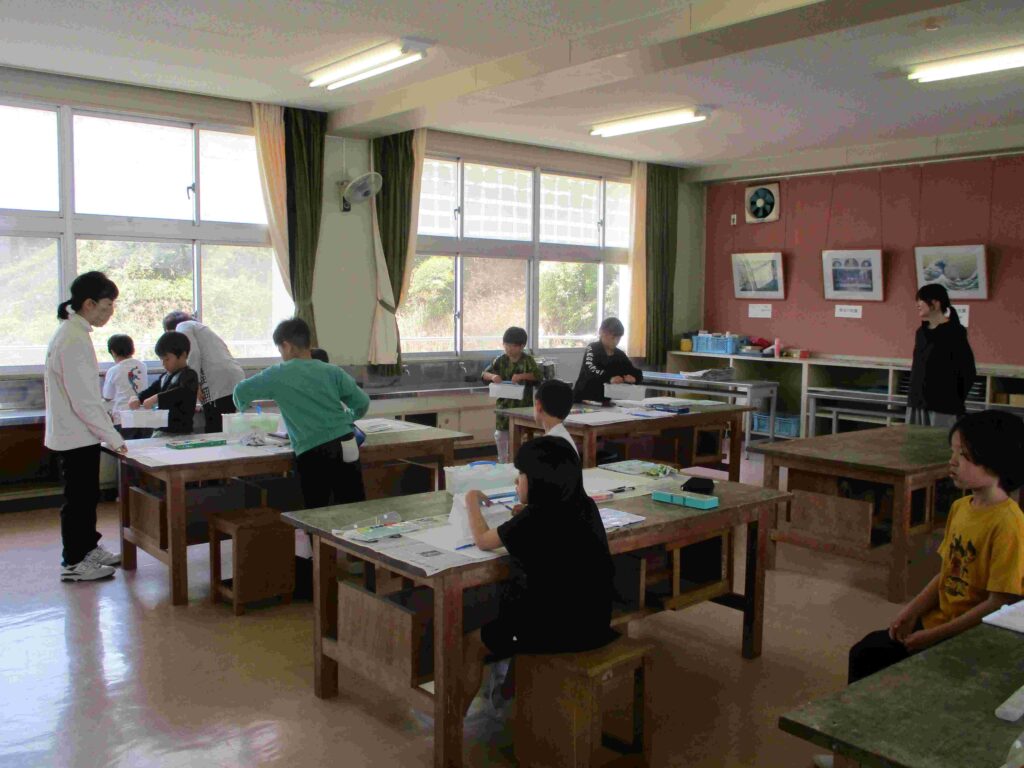 続いて、図工では水彩のオリエンテーション。道具の使い方、水の量、絵の具の薄め方等にチャレンジしました。