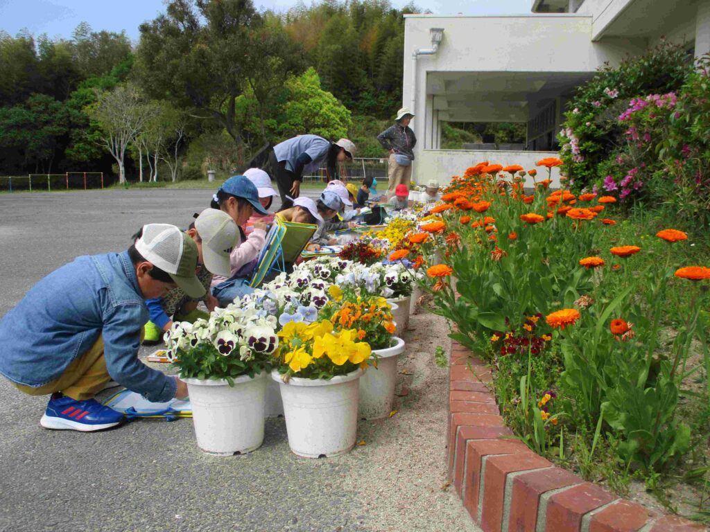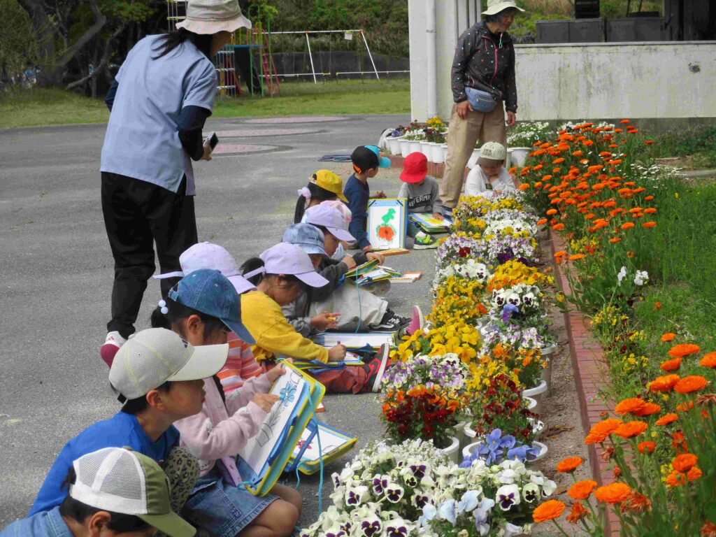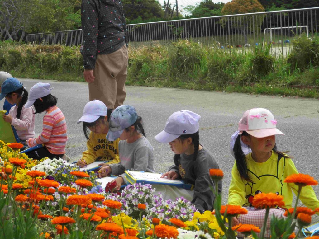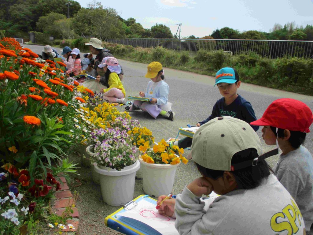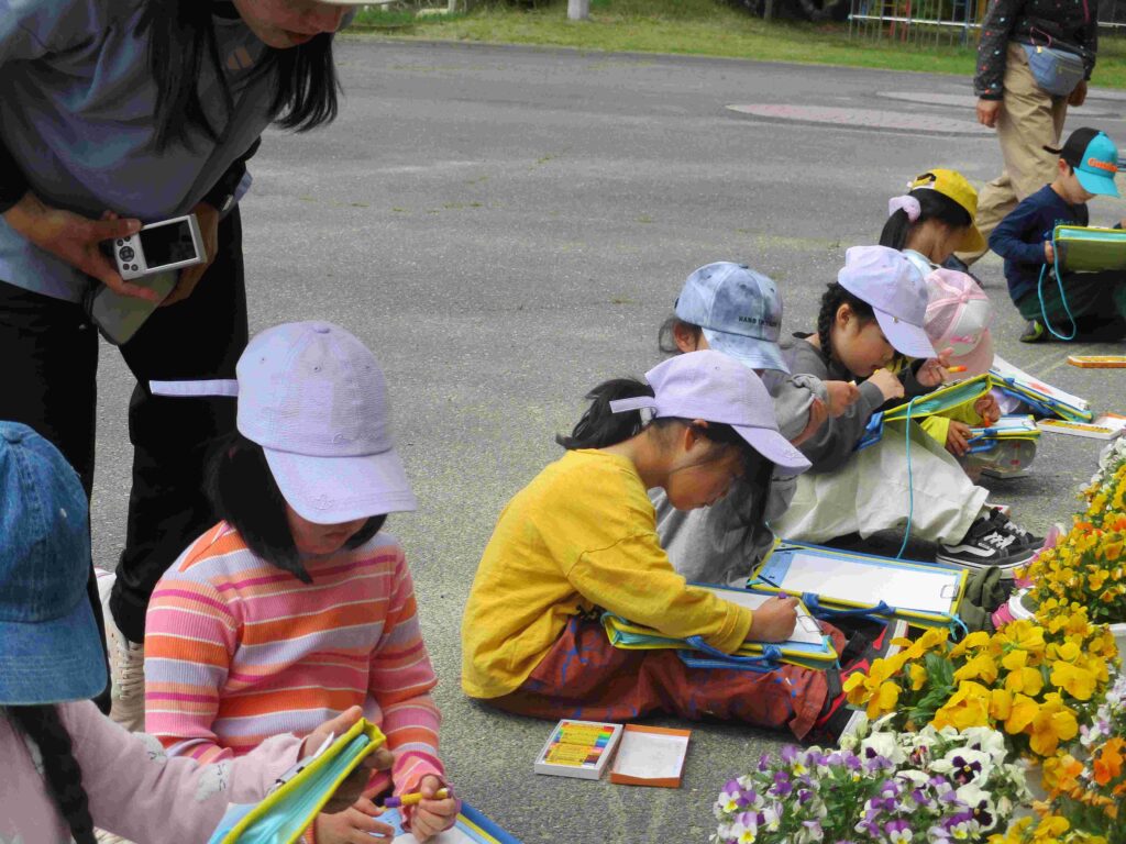 1年生は、生活科の授業で花を描いていました。パンジーの前に座って、「薄く塗って他の色を上から塗るの」「リアルになった」など、口にしながらクレパスを動かしていました。薄曇りの屋外での学習は心地よかったです。しっかり花が描けていました。