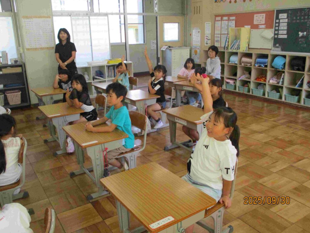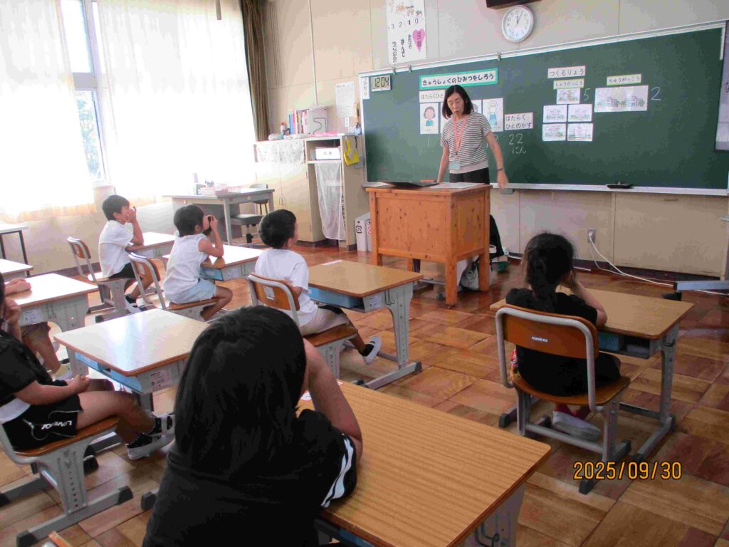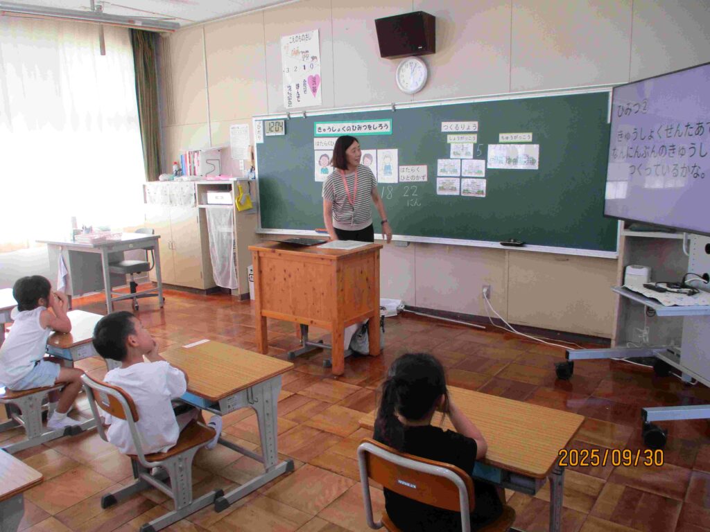 1年生は食の先生をお招きして「きゅうしょくの ひみつを しろう」をテーマに学習しました。手始めに給食センターの様子について考えたり答えたりしていました。食数やセンターで働く方の仕事着、仕事内容などたくさん知ることができました。