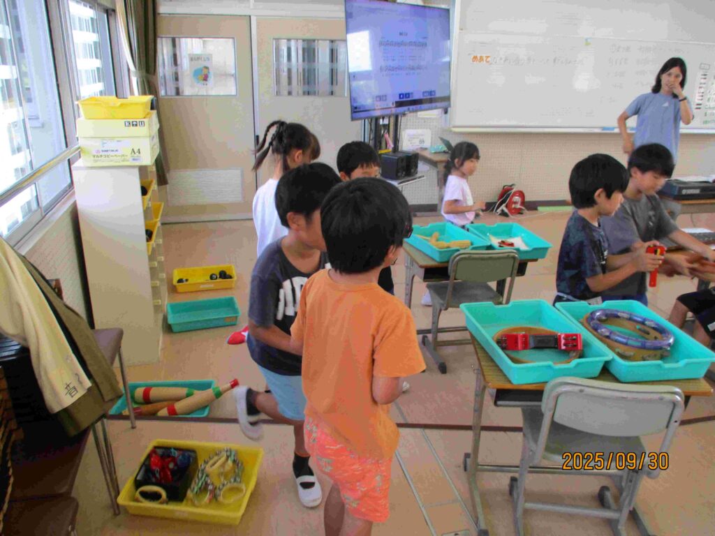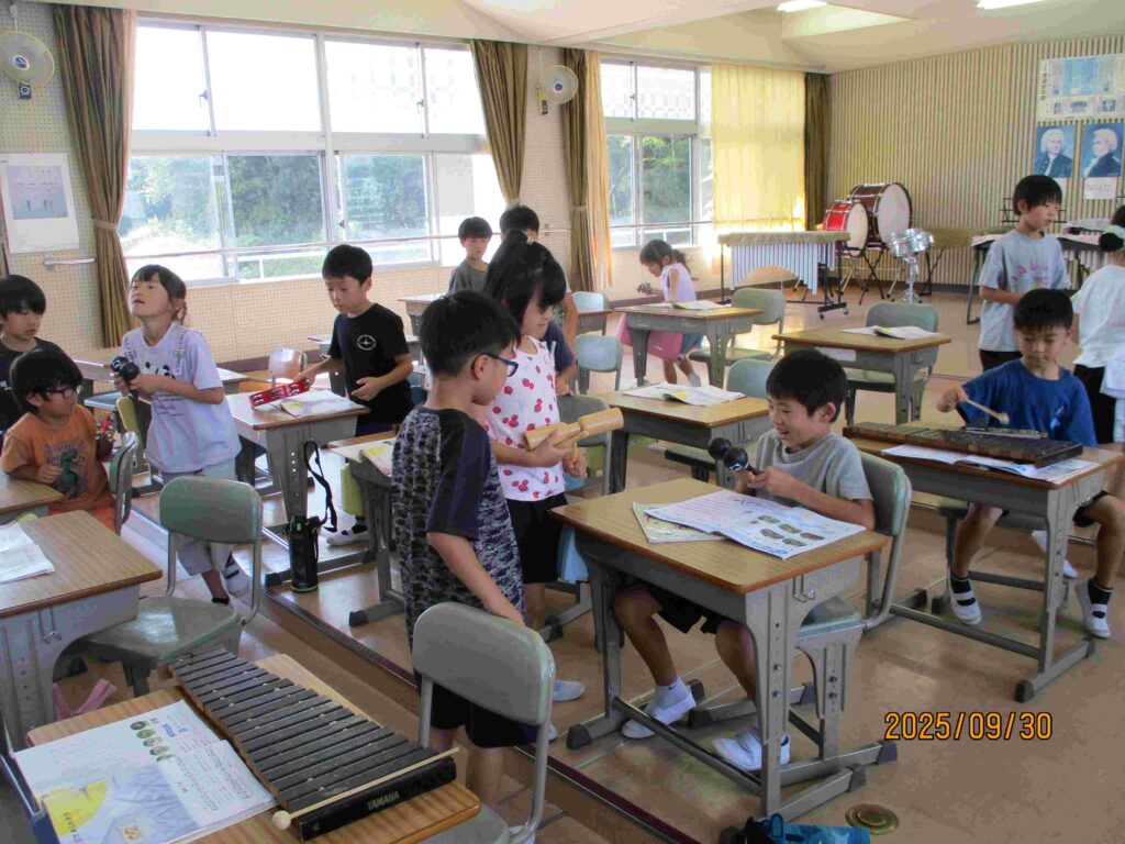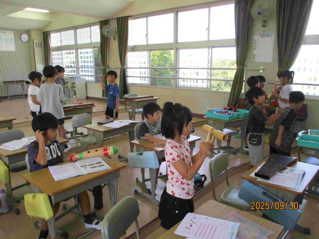 2年生音楽では、「虫の声」の学習です。「虫の声」に合わせて音を奏でます。グループで思い思いの楽器を手にして歌に合わせて楽器を鳴らしました。そっと鈴を鳴らしたり、拍子木を小刻みに打ったりして虫の声を表現しました。