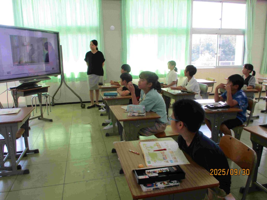 4年生外国語では時間の表現を学習していました。電子黒板に示された時計を見て、答えていきました。時差のことが話題になり、国内に時差がある国についてや、日本と他国の時差についても学ぶことができました。