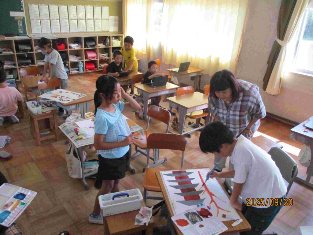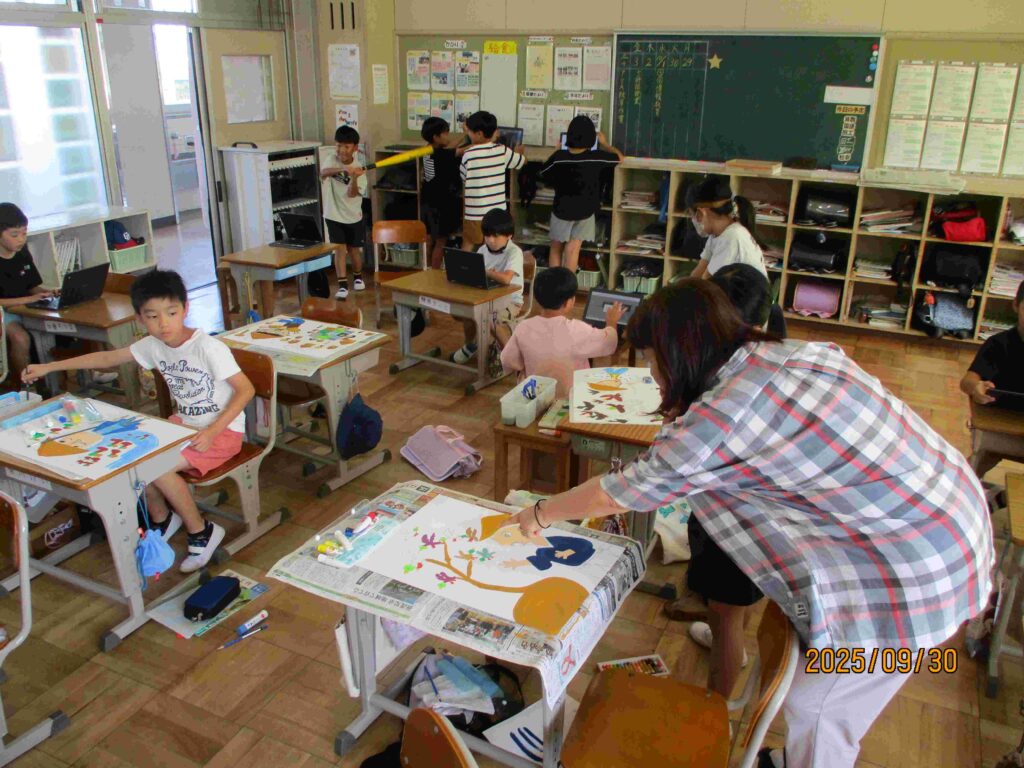 3年生図工「物語を描く」も終盤を迎えました。どの作品もとても伸びやかに美しく仕上がってきました。また、作品を完成した子から、版画に使うための写真撮影が始まりました。被写体の大きさをタブレットで調整し次時に備えました。