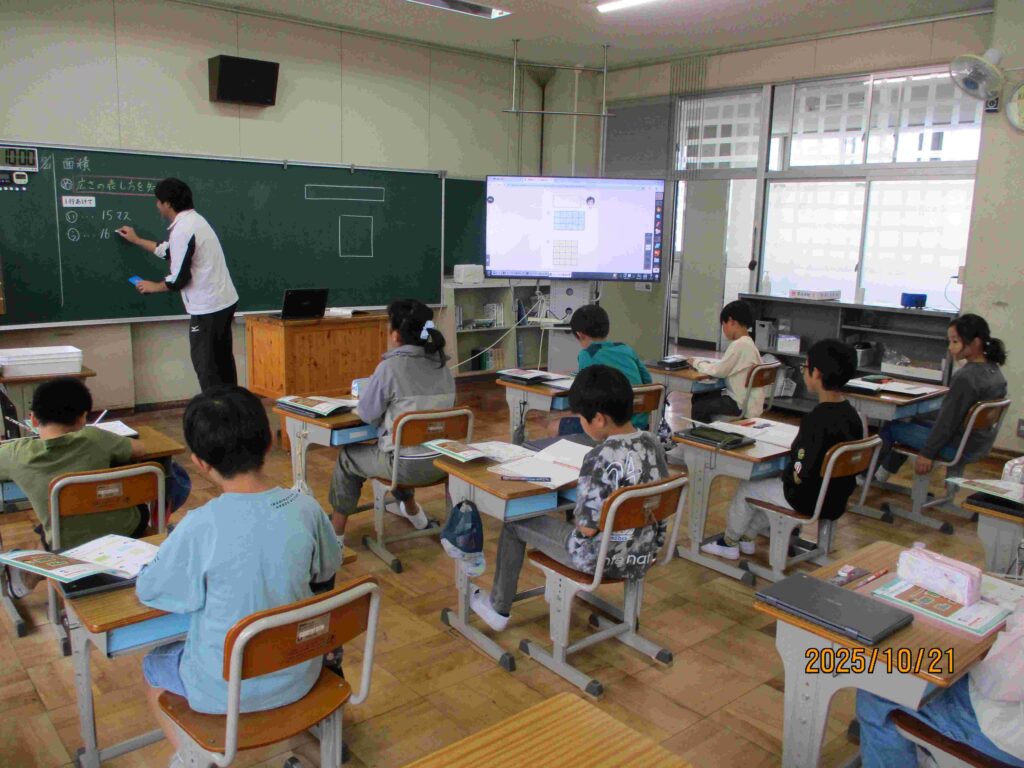 4年生算数「花壇の広さは」でマスの数から面積を求めていました。マスがいくつあるか数えるところから、かけ算を利用したり、図形ごとに区切って合わせたり、大きく求めてから必要ない部分を引いたりと様々な考え方に挑戦していきます。