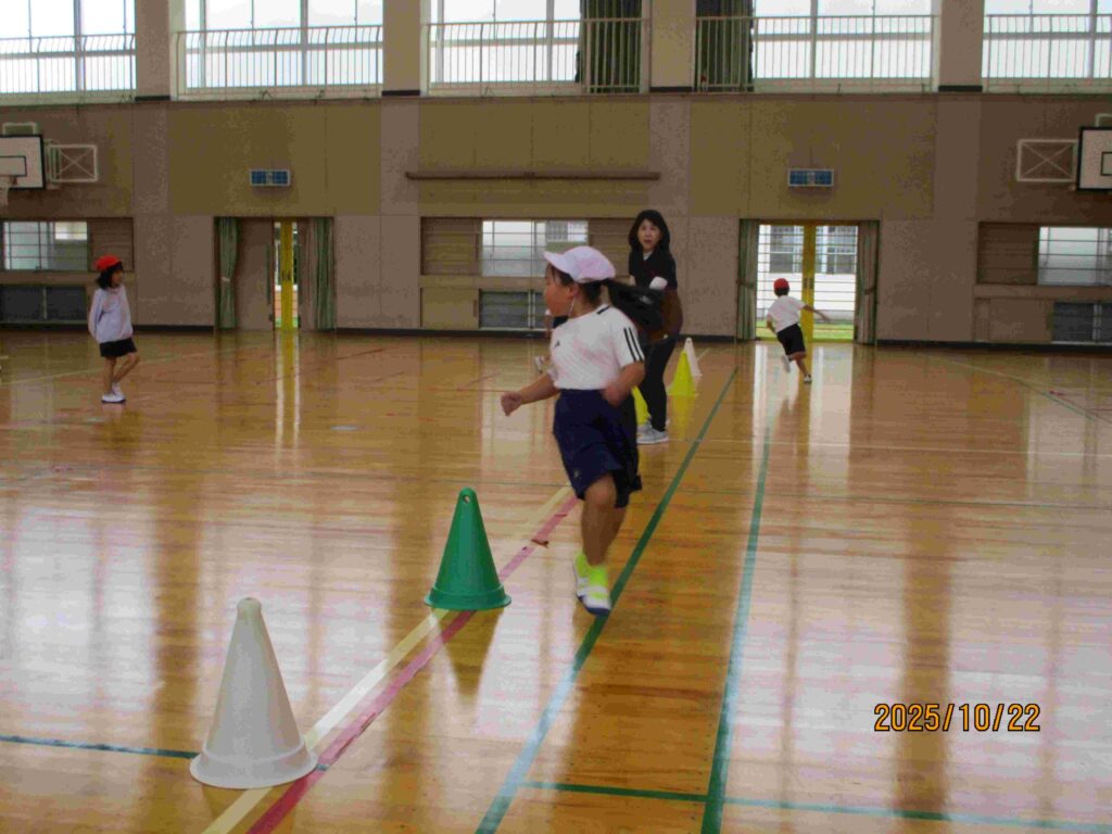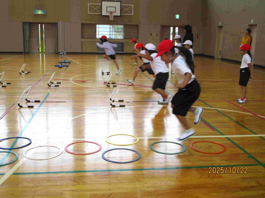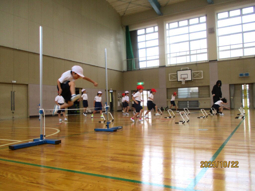 1年生体育「走運動」では、ケンパやミニハードル、ゴムバーが設置されたコースを挑戦。走って、跳んでと楽しみながら体を動かしていました。軽い身のこなしでスピードに乗って何度も挑んでいました。