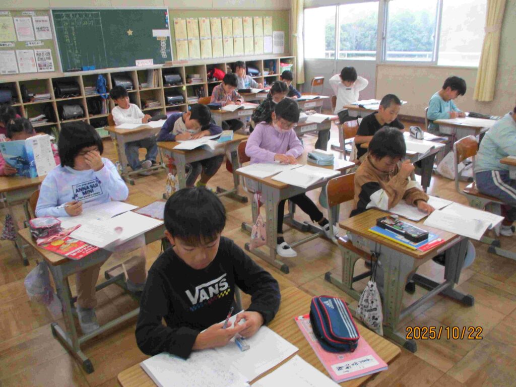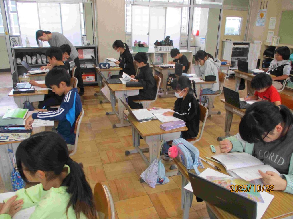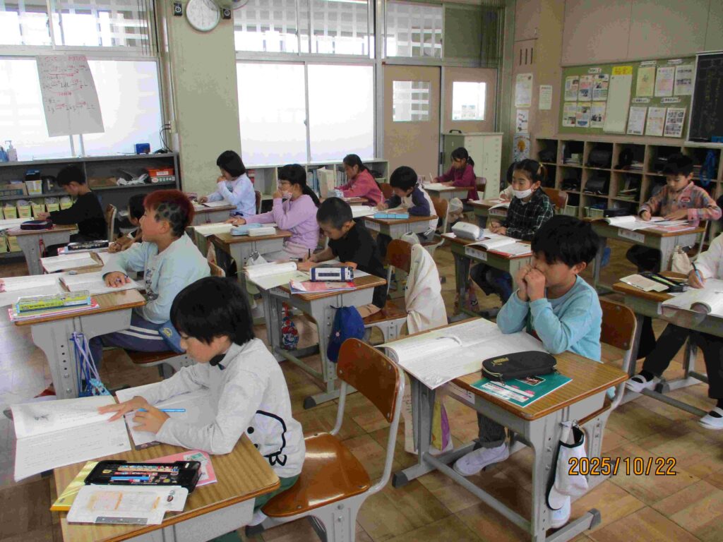 3年生国語「ちいちゃんの かげおくり」では、強く印象に残ったことについてまとめていました。友達の発表を受け止めつつ、自身の思いに加えていったり、新たな視点から考え直したりしながらノートに書き留めていました。