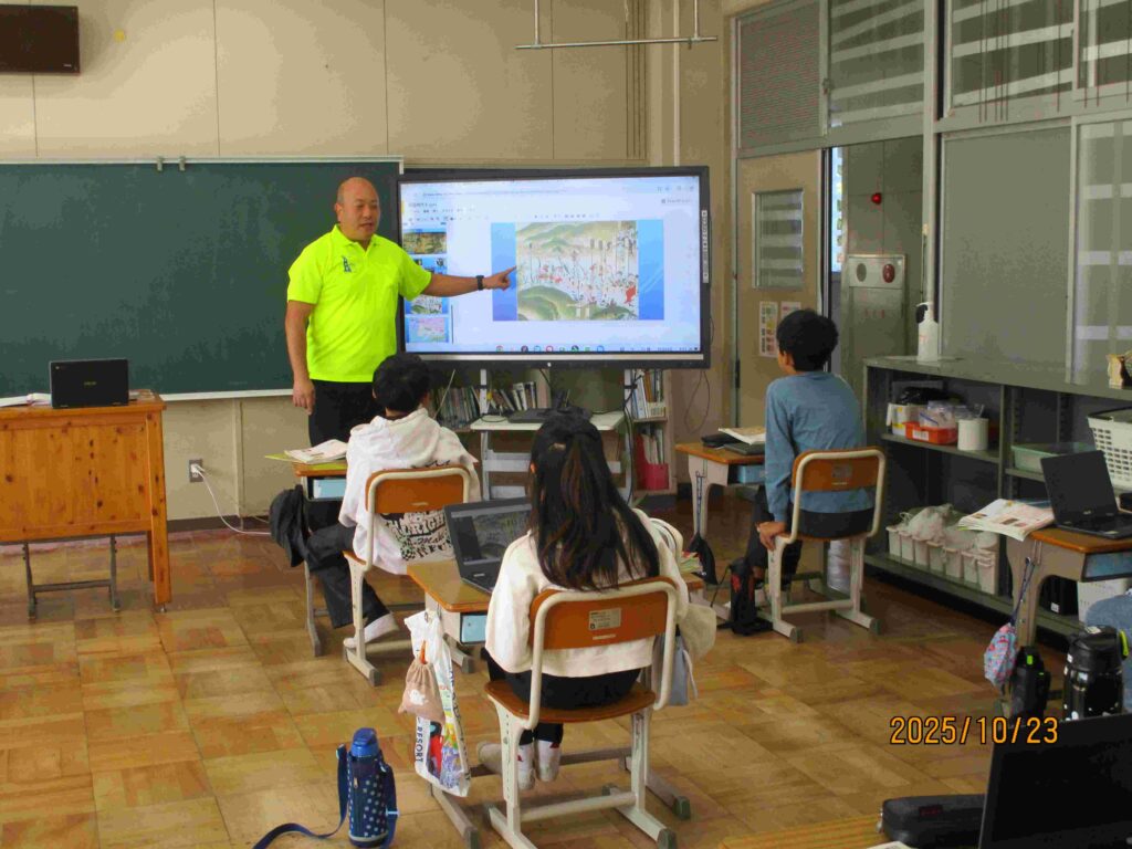 6年生社会では、「なぜ、織田軍は強かったのか」を考えていました。長篠合戦図屏風にヒントがあるとのことで、屏風の一部をクローズアップした画像を見て考えました。「鉄砲かな」「旗印?」「やり?」「え、何でだろう」などいろいろと思いつくことを頭に浮かべタブレットに入力していきました。屏風に描かれた旗印と織田家の由来とをたぐり寄せると見えてくる物がありました。歴史の面白さを子どもたちは味わっていました。