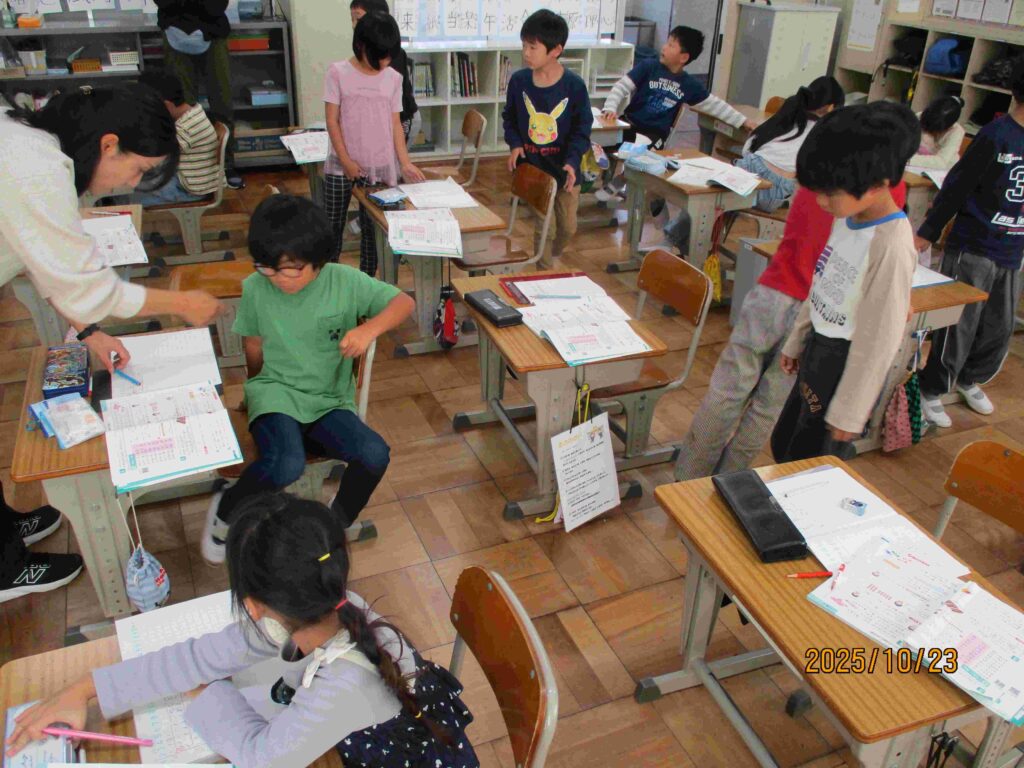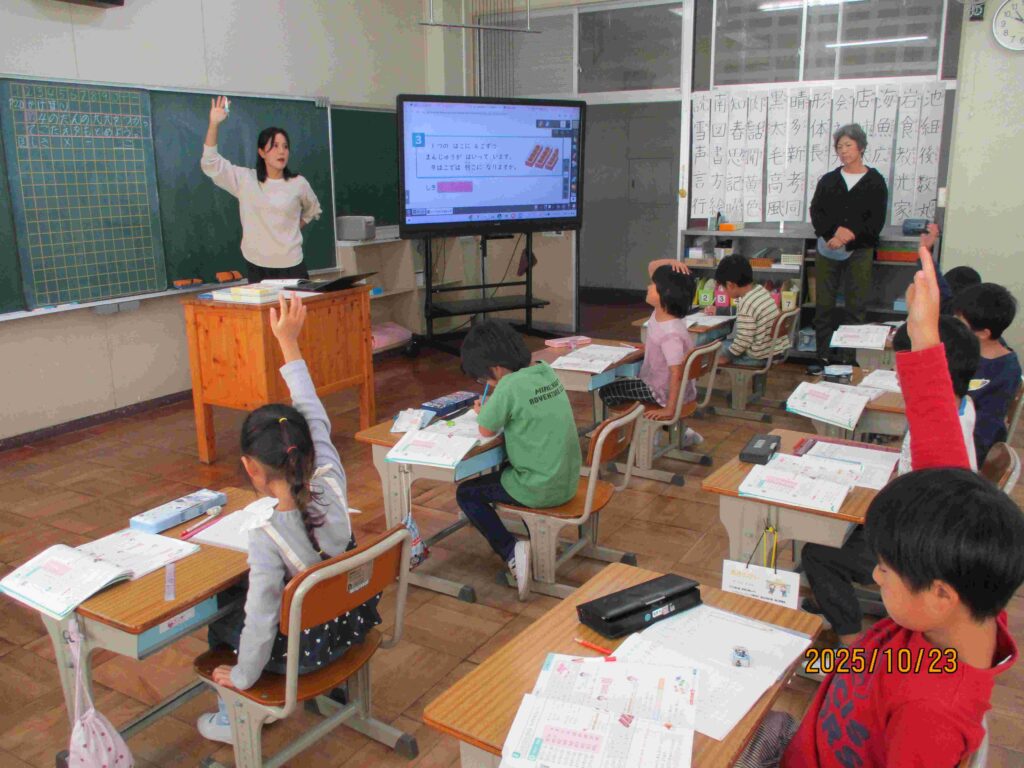 2年生算数「かけ算」の学習の様子です。先生が提示するフラッシュカードの5の段と2の段をテンポよく答えていくと、続いて「4の段のかけ算」の演習問題に挑戦していました。考え方や式について互いに確認し合っていきました。