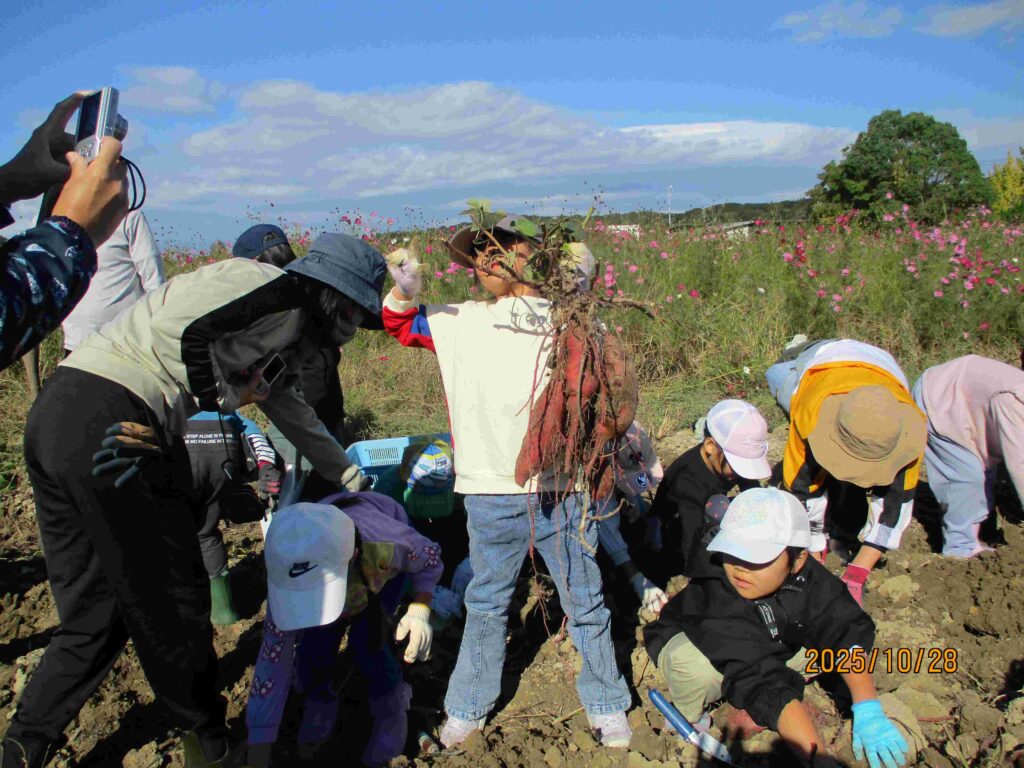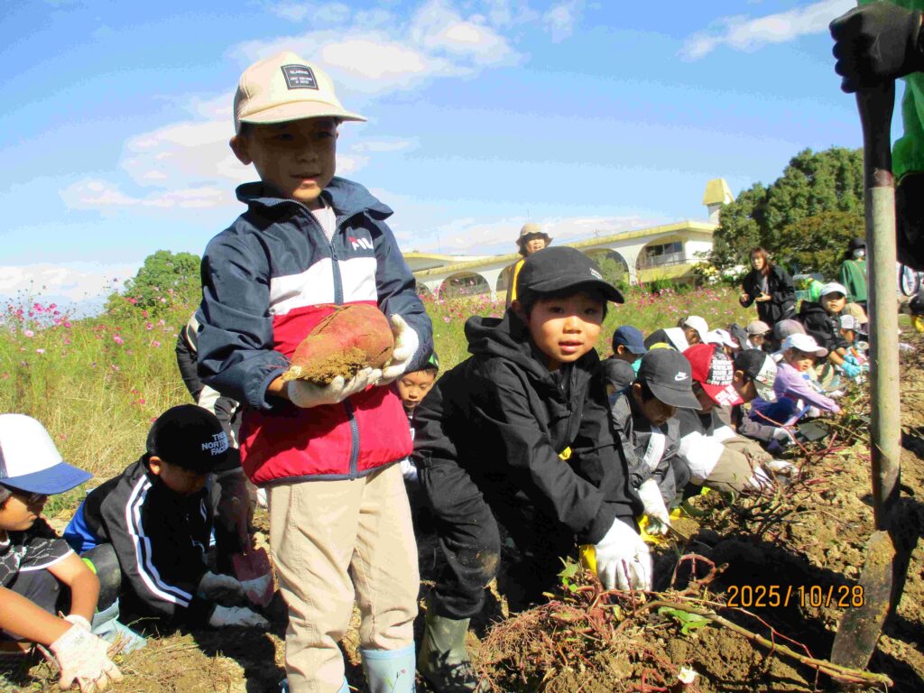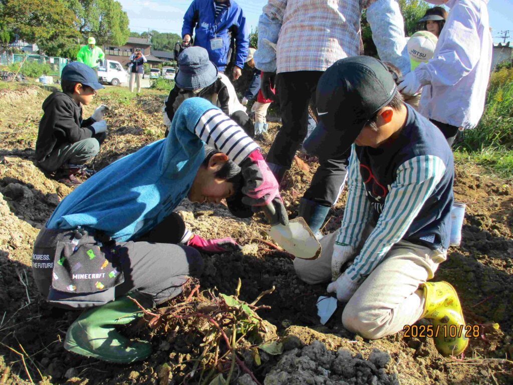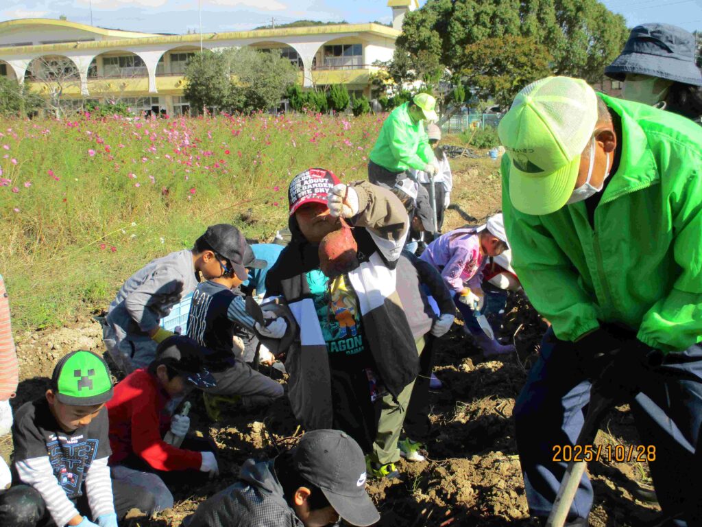 今日は1、2年生がお芋掘りに挑戦しました。「やったー!大きい!」「採れた!」大きなサツマイモを手に取り、子どもたちが歓声をあげていました。芋を傷つけまいとスコップでていねいにサツマイモにアプローチ。最後はツルを引いたり、手で掘り起こしたりと大奮闘。大きなシャベルを持った地域の方に助けを求める一コマもありました。子どもたちは宝物が出てきたかのような喜びようでした。大収穫でした。