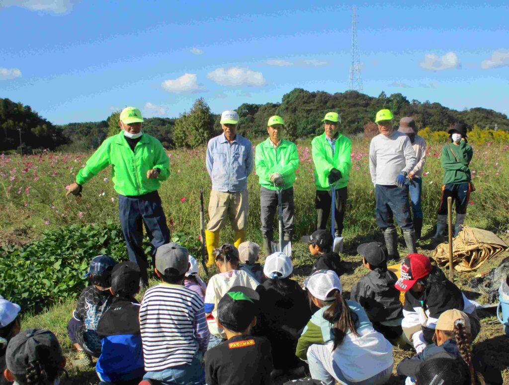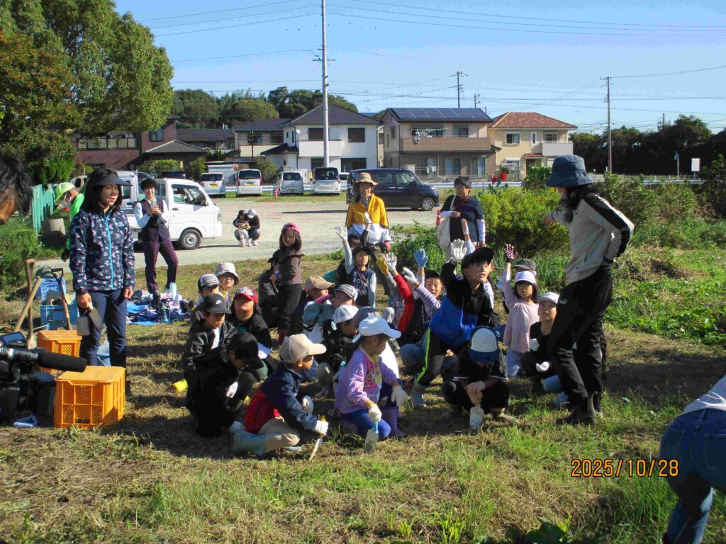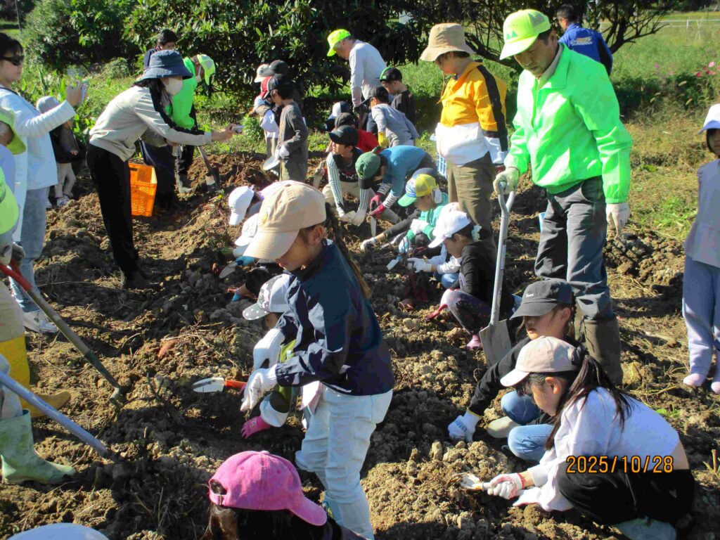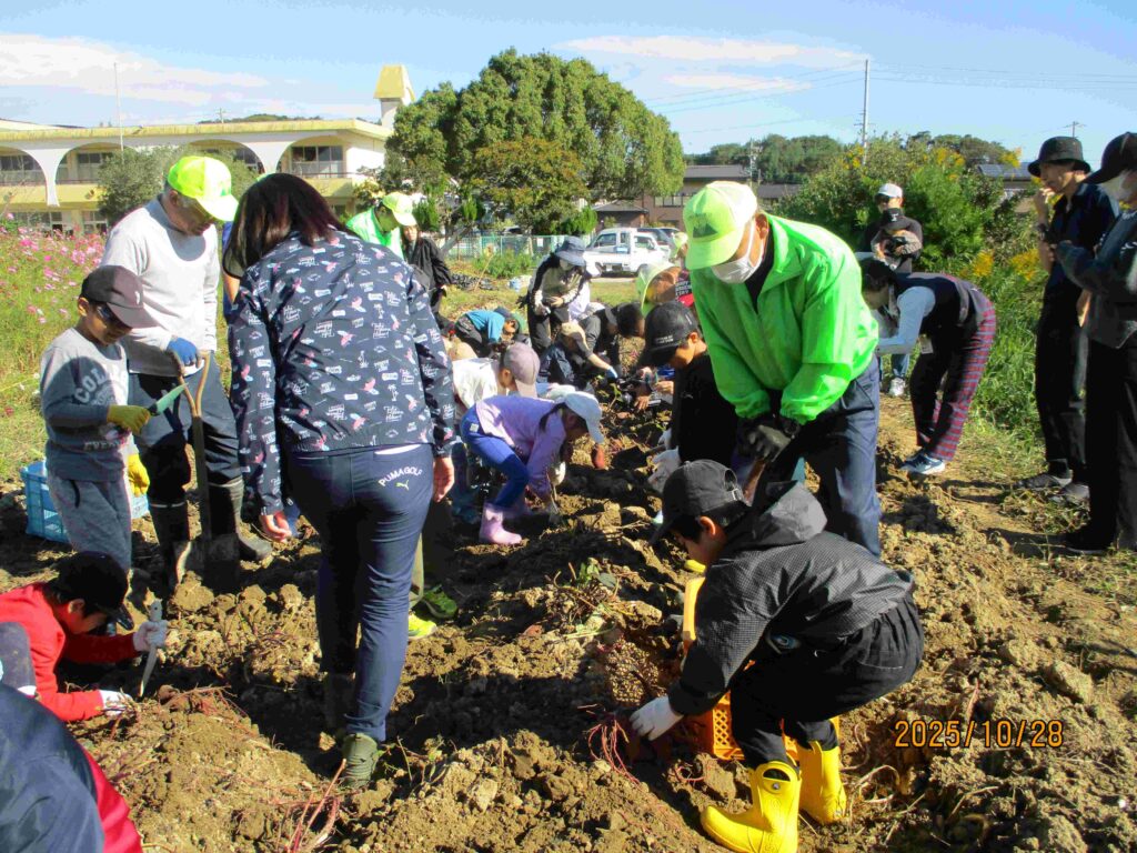 今日は1、2年生がお芋掘りに挑戦しました。「やったー!大きい!」「採れた!」大きなサツマイモを手に取り、子どもたちが歓声をあげていました。芋を傷つけまいとスコップでていねいにサツマイモにアプローチ。最後はツルを引いたり、手で掘り起こしたりと大奮闘。大きなシャベルを持った地域の方に助けを求める一コマもありました。子どもたちは宝物が出てきたかのような喜びようでした。大収穫でした。