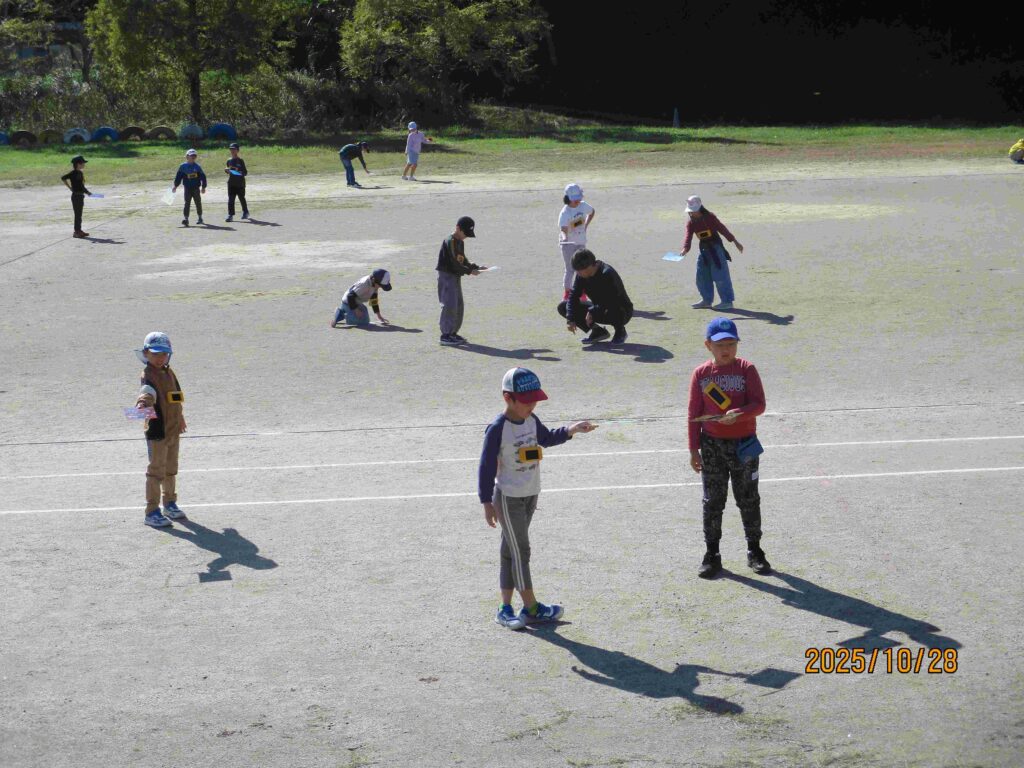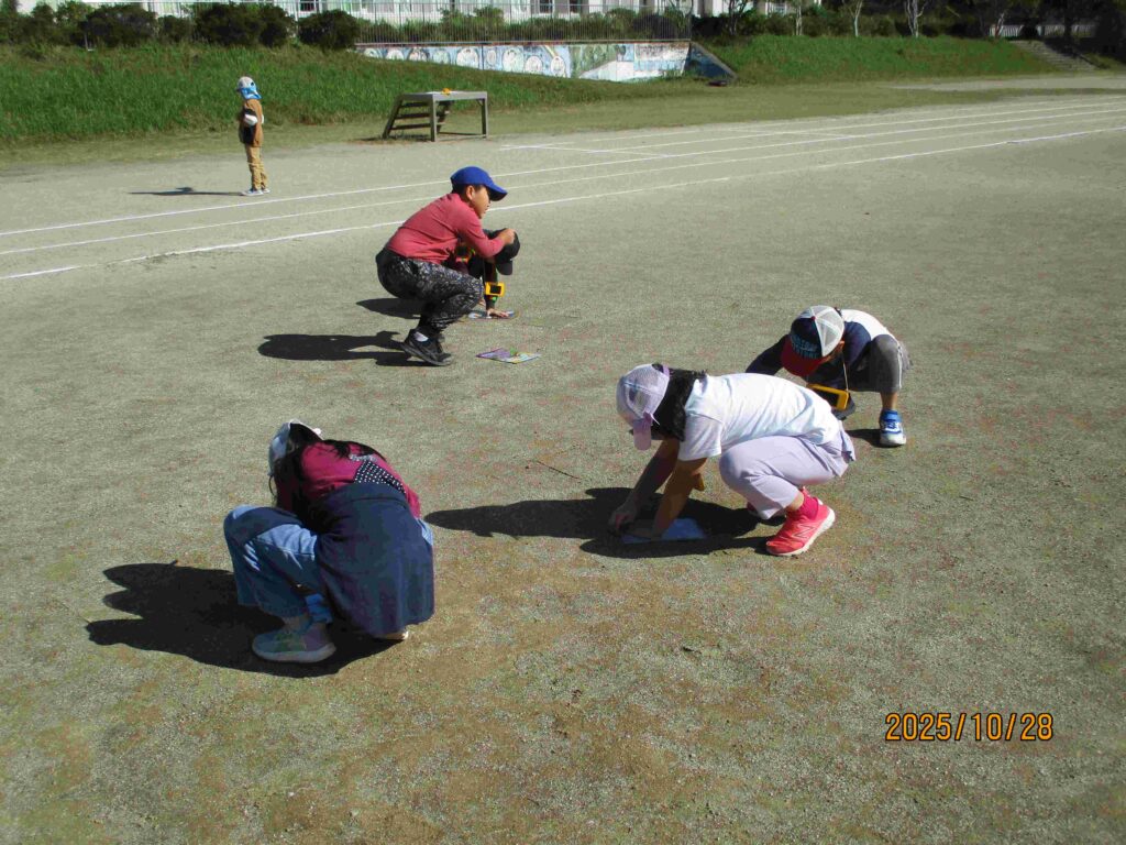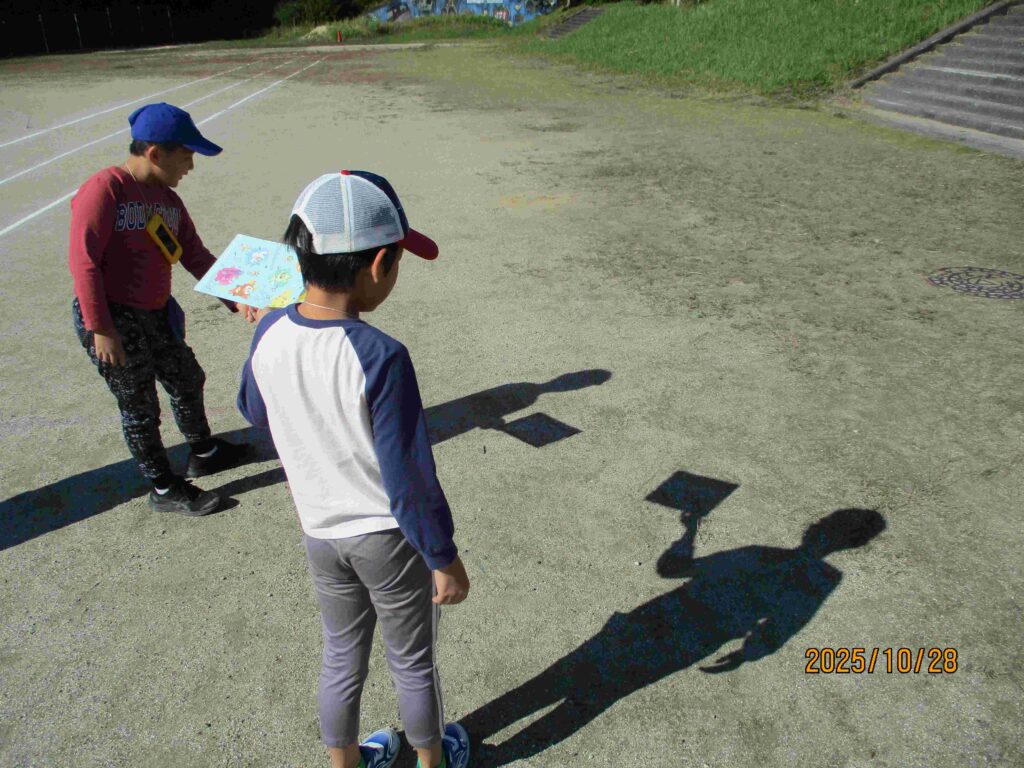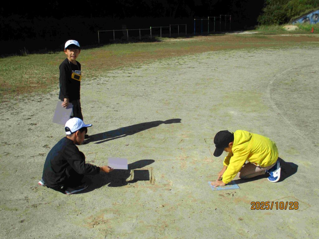 3年生が理科の学習で運動場に出てきました。すると、自分の影の伸び方や反対側の太陽の位置を確かめていました。いろいろな影を作ったり、地面に書いた長方形に合わせて下敷きの影を合わせたりと楽しみながら学習をしていました。影と太陽の関係をつかんでいました。この先、時間の経過による太陽の動きと影の長さについても調べて行きます。