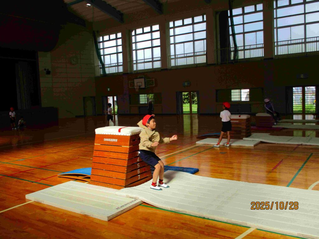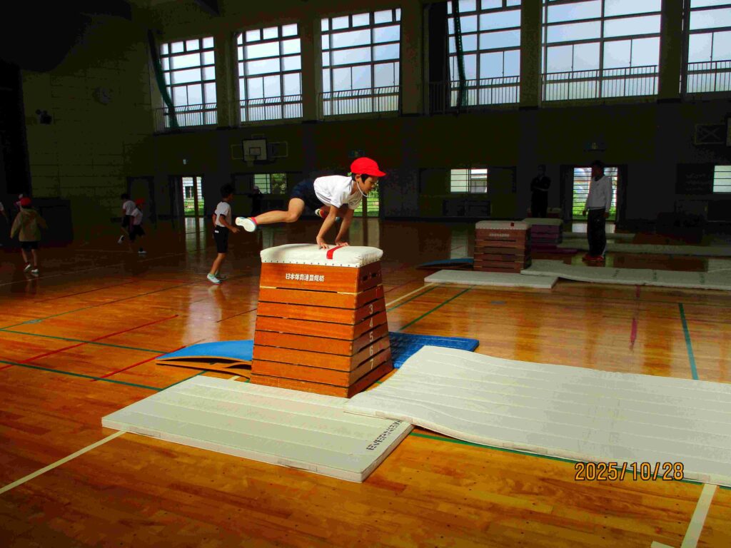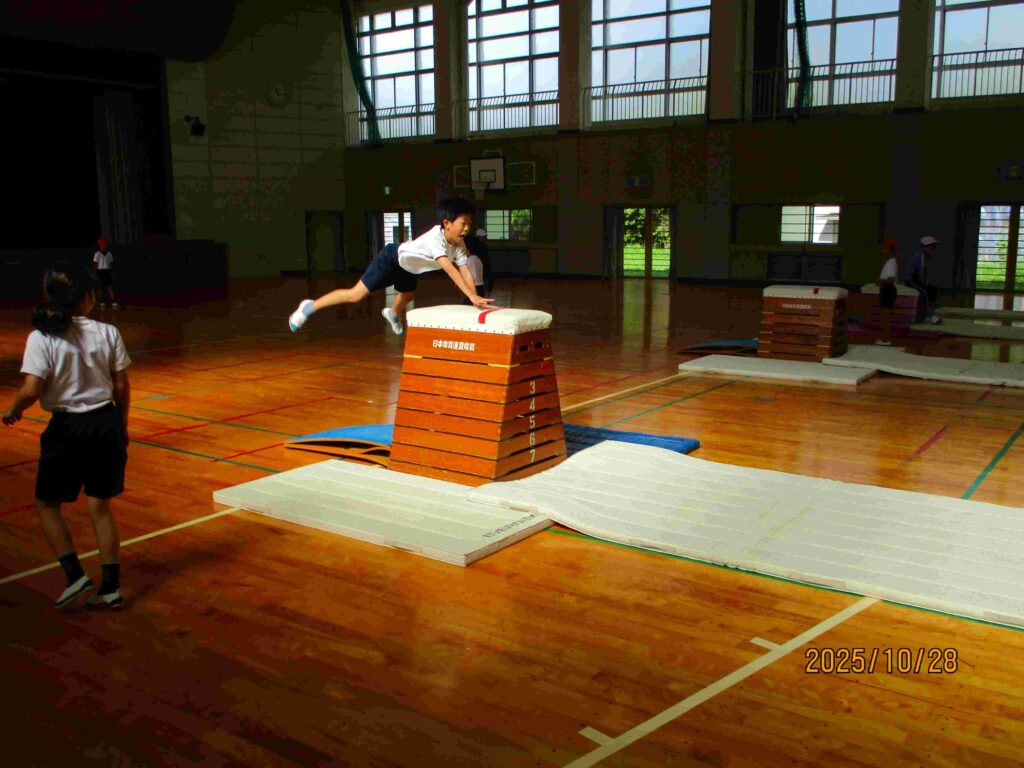 4年生体育 跳び箱運動では、開脚跳びや台上前転の練習に励んでいました。踏み切りから着手、着地まで気を付けて、技を仕上げていました。互いに見合い、友達にアドバイスを伝えていました。
