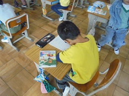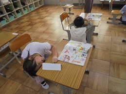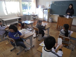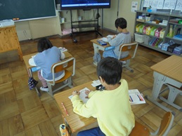 1年生は、図工です。「おって たてたら」という学習で、画用紙を二つ折りにして、立てて動物や自動車などを作ります。子どもたちは、紙をおると、「トンネル~。○○が見えた~」と言って楽しんでいました。子どもの想像力は∞です。どんな作品ができたかな?
