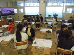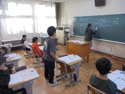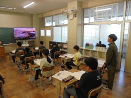 5年生は、理科。「流れる水のはたらき」です。流れる水の量が多くなると「浸食」「運搬」「堆積」はどうなるか、自分たちの考えを発表します。その後、自分の考えが正しいかどうか実験します。どのようにすれば、実証できるか実験方法を周りの子たちを話し合いました。