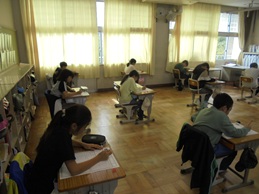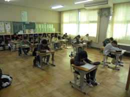 6年生は、家庭科のテストを受けている様子です。テスト前に教科書を見直し、いざ、テスト。結果は…。最後まであきらめずがんばりました。