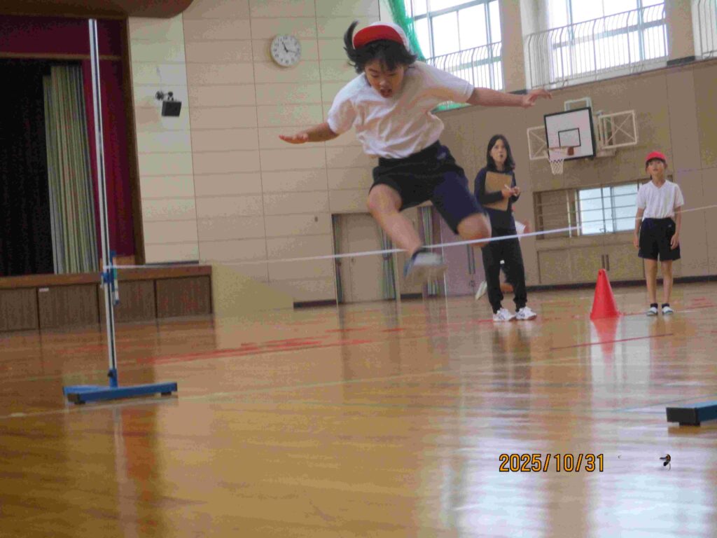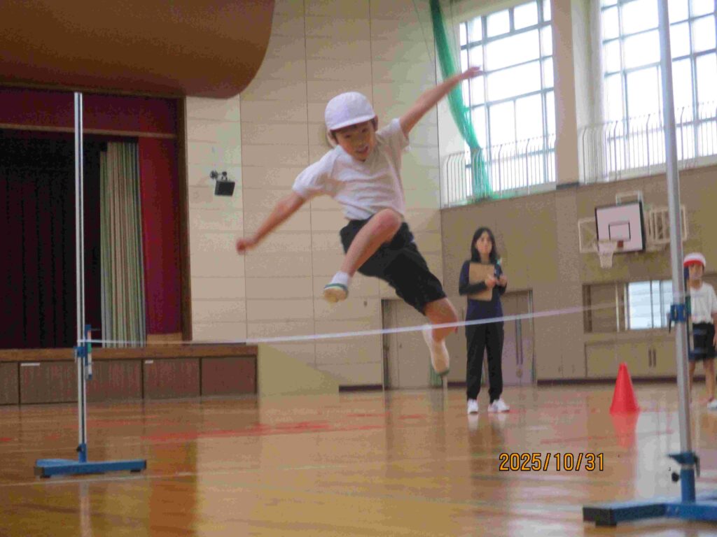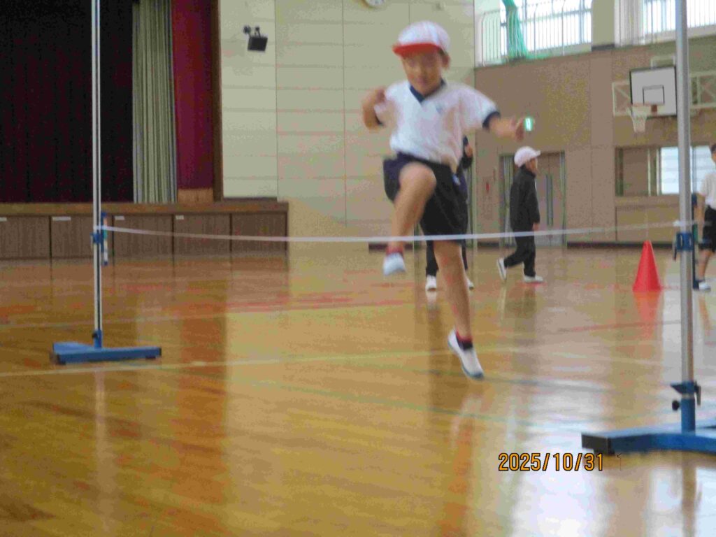 2年生体育、跳運動遊びの様子です。力強く踏み切ってゴムを跳び越えていました。軽やかなジャンプでした。