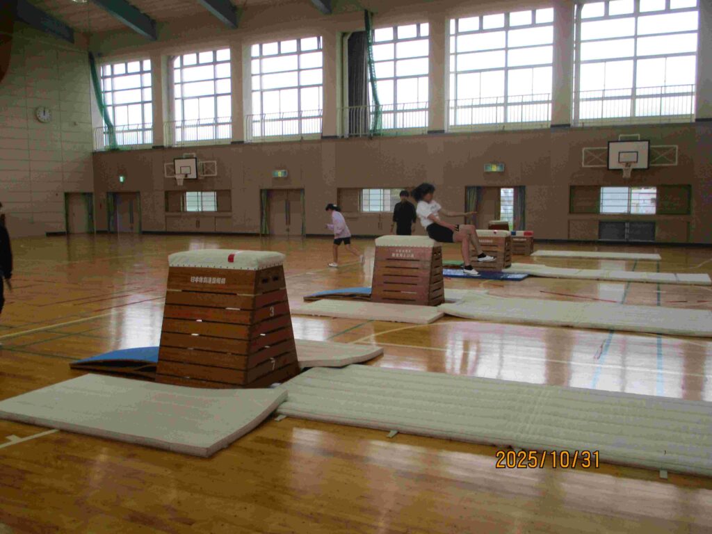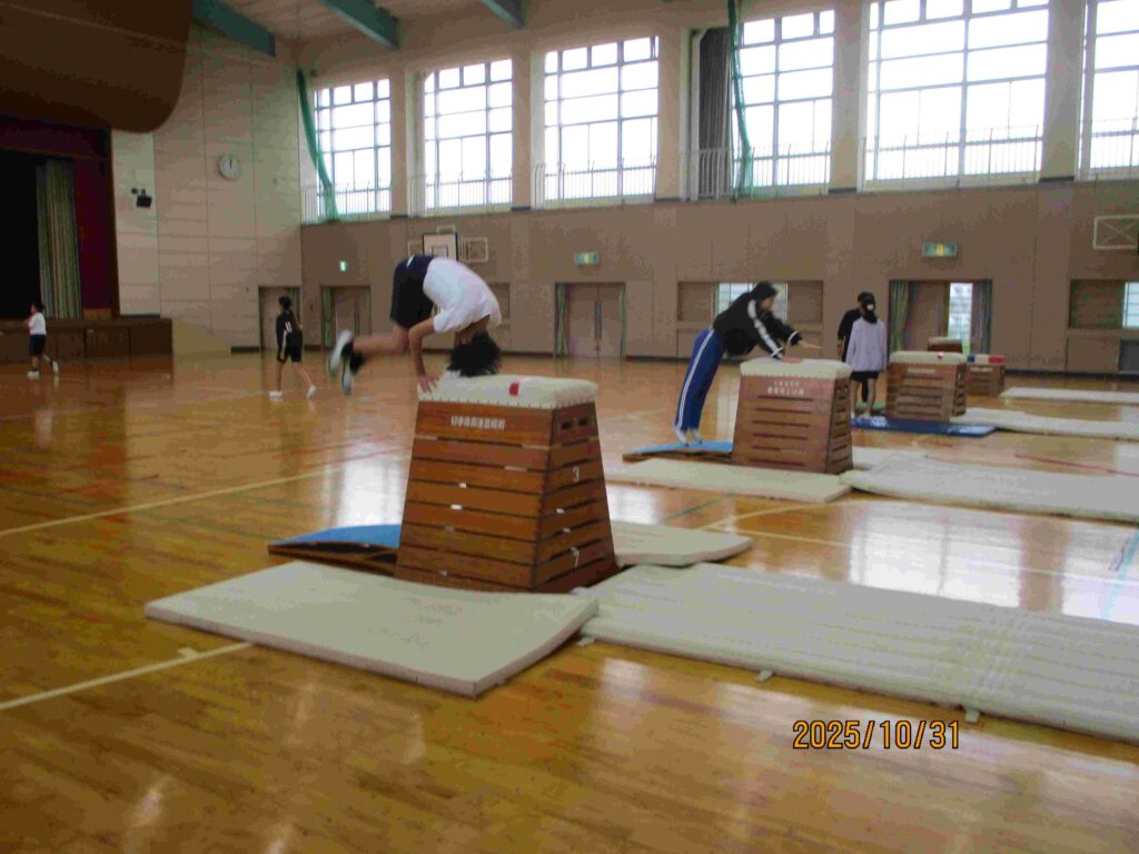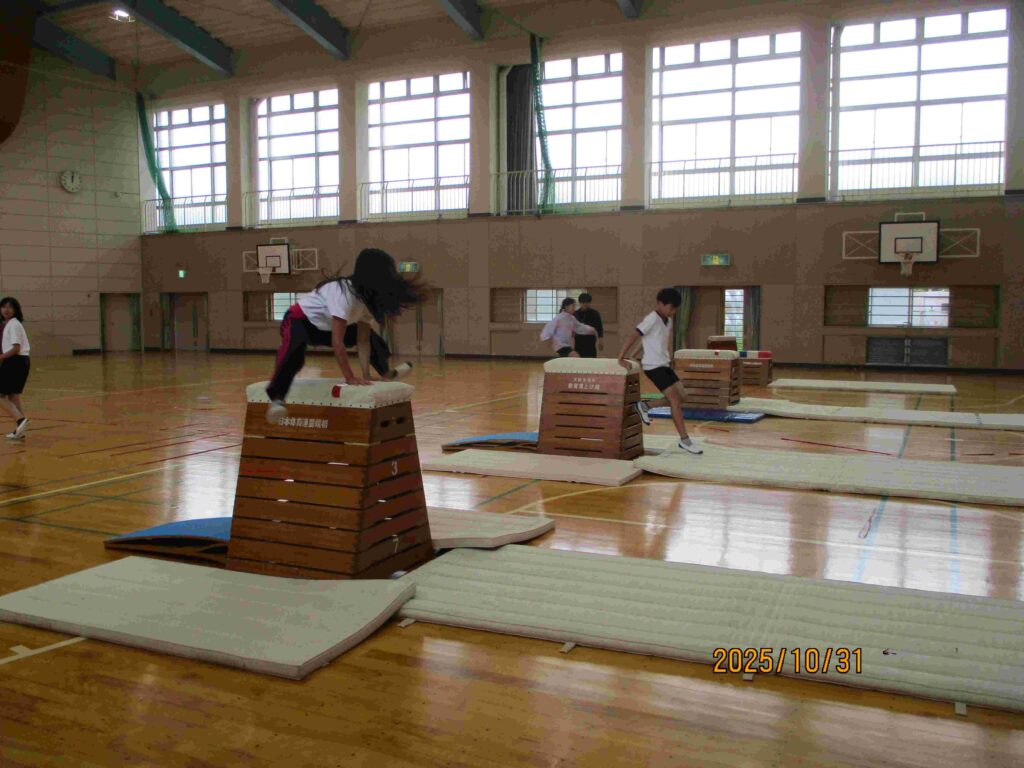6年生体育 跳び箱運動の様子です。開脚跳びや台上前転の練習をしました。高学年ともなると、同じ技でも力強くダイナミックな動きになります。踏切、着手、空中動作、着地としっかり決まるようになりました。