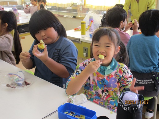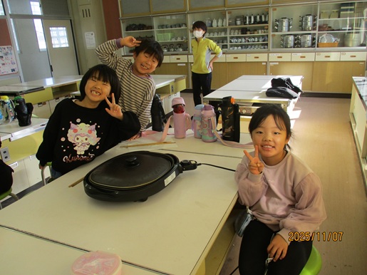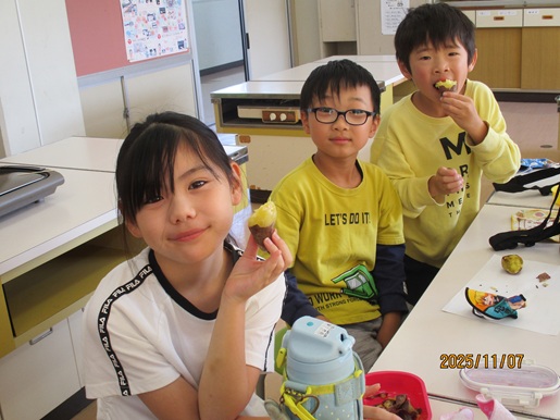 1・2時間目に1,2年生は、先日収穫したサツマイモを料理して「おいもパーティー」をしました。さつまいもを切って、アルミホイルで巻いて、ホットプレートを使って焼きました。できた焼き芋はホクホクで甘く、とてもおいしかったです。