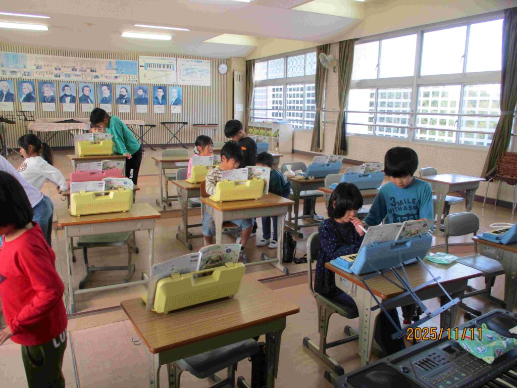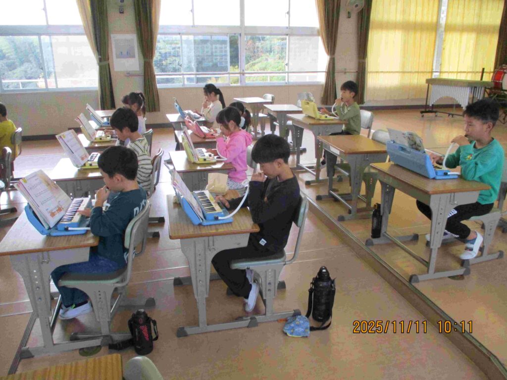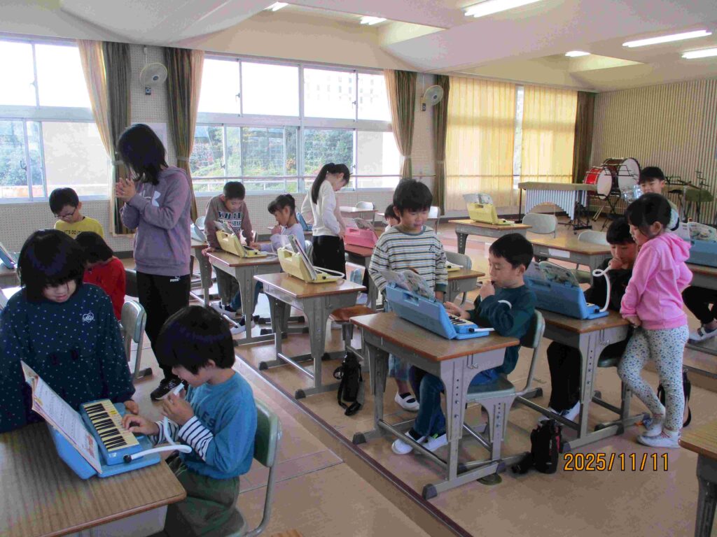 2年生音楽では、鍵盤ハーモニカで「こぎつね」を練習しました。音や運指に気を付けて練習。お互いに見合い、確認。吹き込む息の強さもOK。最後はすてきな演奏ができました。